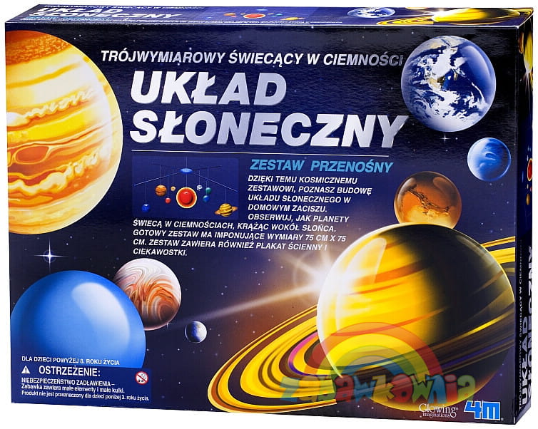 INSPIRUJĄCY PROJEKT DLA CAŁEJ RODZINY! WSPÓLNIE STWÓRZCIE KOLOROWY, DUŻY I MOBILNY UKŁAD SŁONECZNY, KTÓRY W WYJĄTKOWY SPOSÓB OZDOBI WASZ DOM! To doskonała lekcja astronomii dla każdego! Poprzez modelowanie poszczególnych planet z zapałem sięgniecie po więcej informacji dotyczących kosmosu. Nastrój, jaki wywoła barwna konstrukcja w jednym z pokoi, wprawi was zachwyt! Szczególnie po zmroku! ZESTAW UKŁAD SŁONECZNY pozwala na wykonanie modelu o wymiarach 42 x 60 cm. Możecie powiesić go tuż pod sufitem i obserwować planety nawet w pochmurne noce! Dodatkowo otrzymacie duży plakat pełen kosmicznych ciekawostek! ZAWARTOŚĆ: 1 zestaw z tworzywa sztucznego, UWAGI: Wymiary opakowania: 28,5 cm x 37,5 cm x 6,5 cm