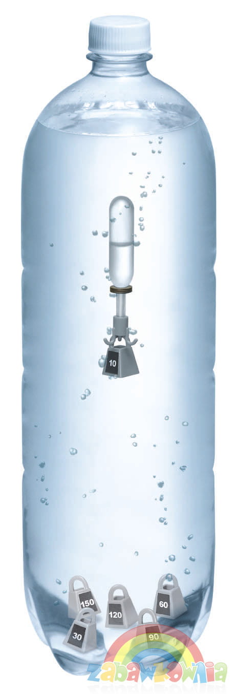 3. Włóż odważniki oraz nurka do butelki wypełnionej wodą i zakręć butelkę. Tak dobierz ilość wody wewnątrz nurka, żeby unosił się nad powierzchnią wody.