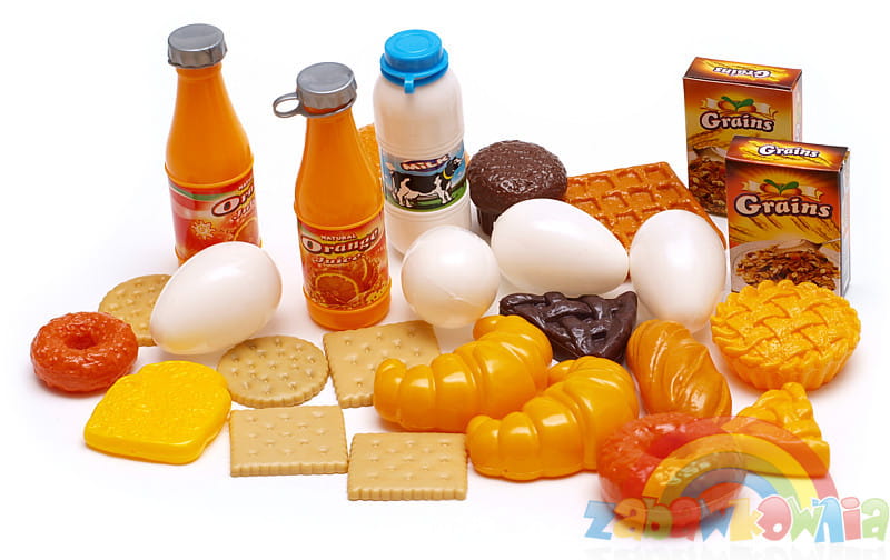 Atrapy artykułów spożywczych, które uatrakcyjnią dzieciom zabawę w sklep, kuchnię i dom. Dzieci będą mogły podczas zabawy w sklep wyposażyć półki swojego stoiska w rozmaite artykuły znane ze sklepów spożywczych takich jak jajka, płatki śniadaniowe, mleko, sok, bułeczki, rogaliki i ciasteczka.