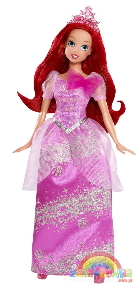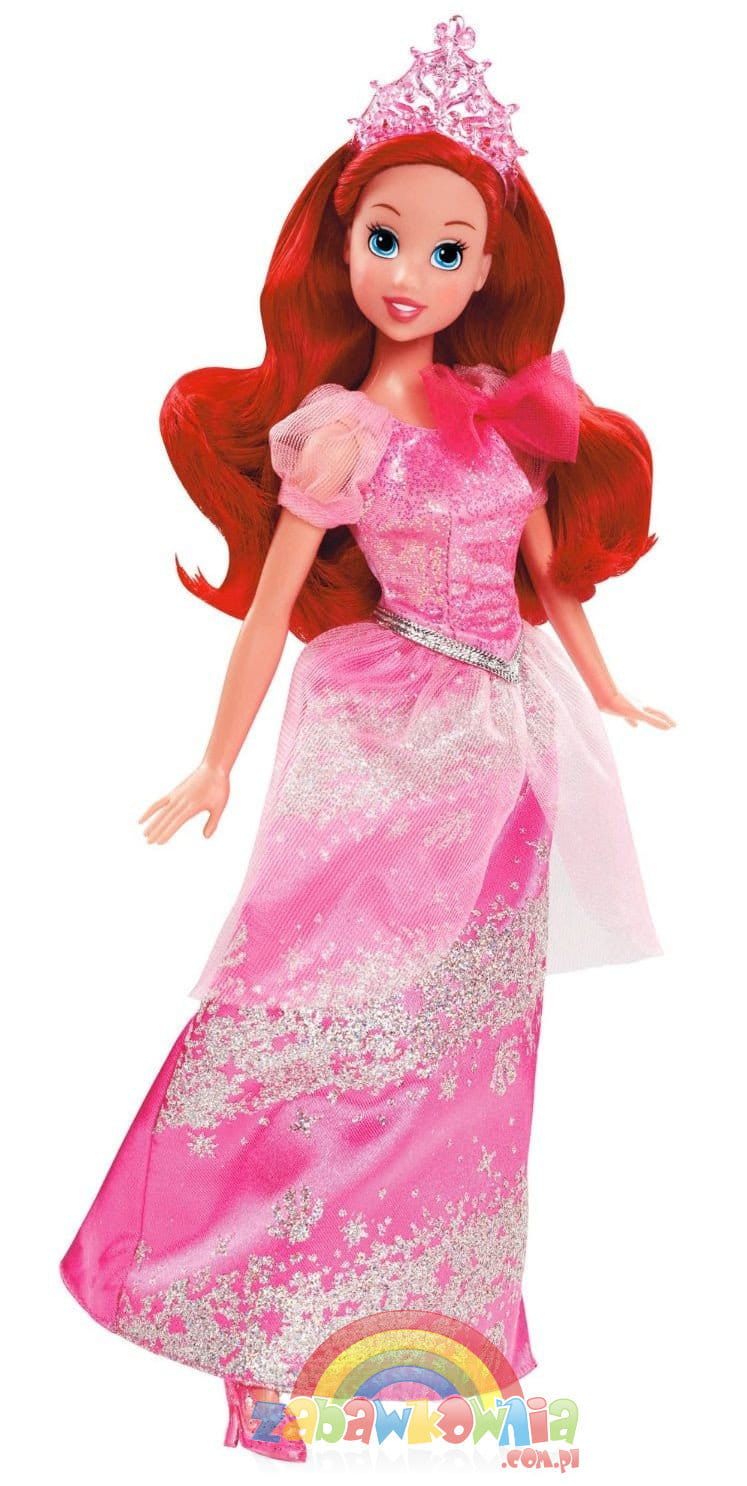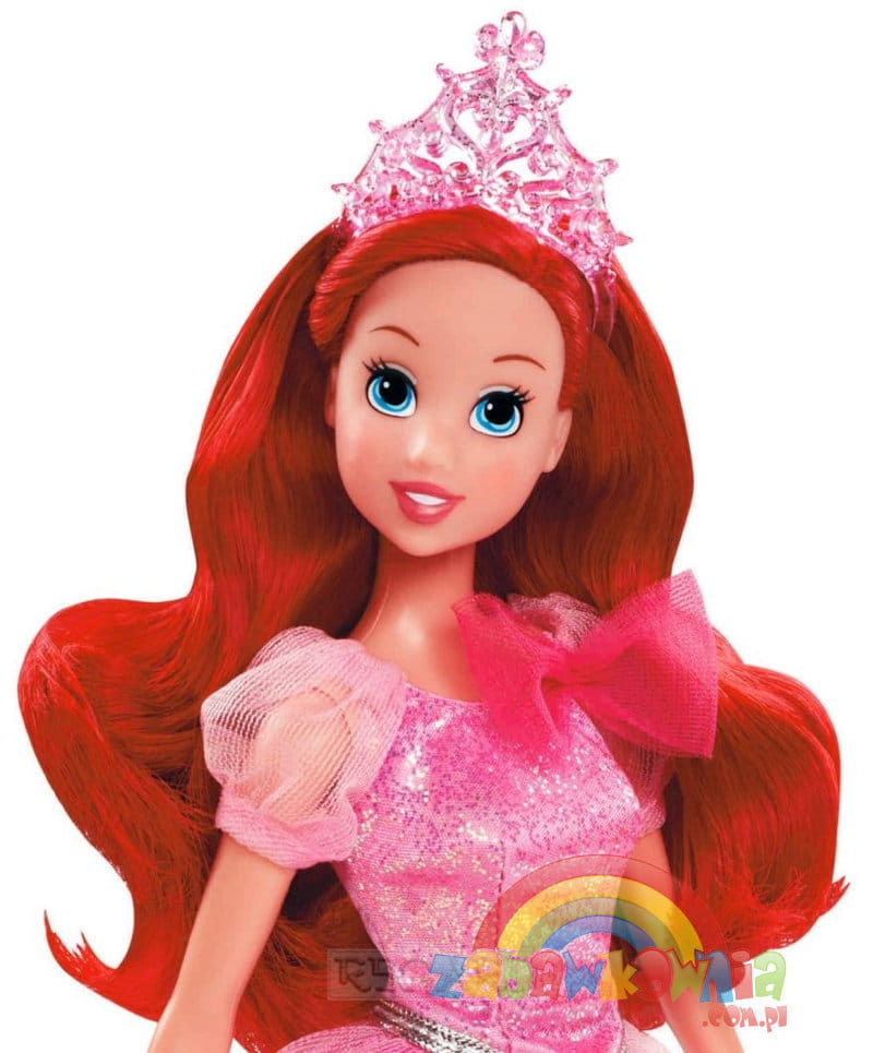 Arielka o rudych włosach i dużych niebieskich oczach wyszykowana już na bal księżniczek. Ubrana w swoją wspaniałą błyszcząca różową suknie balową z diademem na głowie wygląda olśniewająco. Ma też cudowne kryształowe pantofelki.