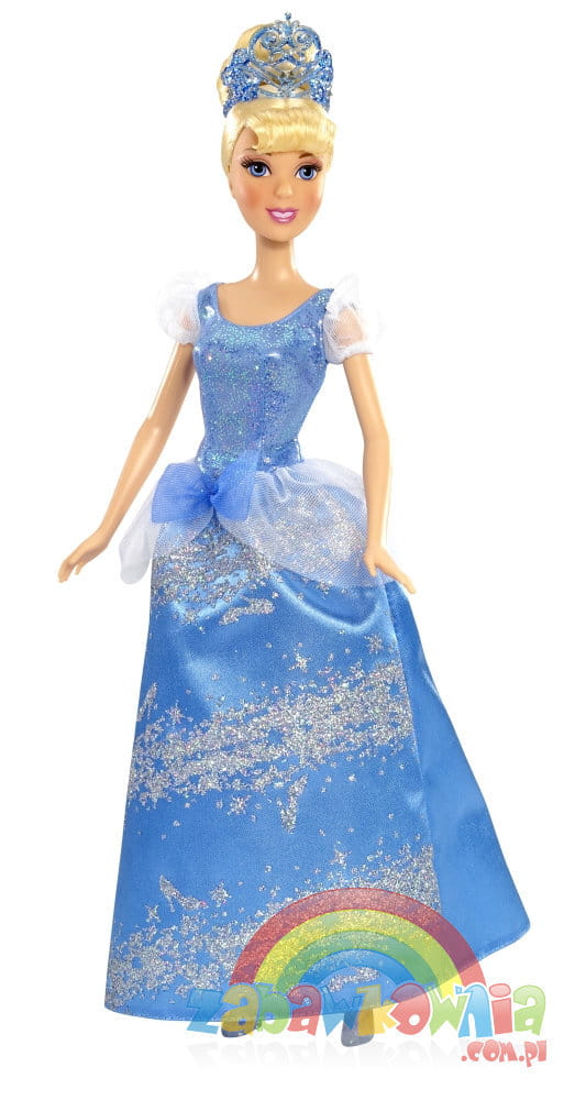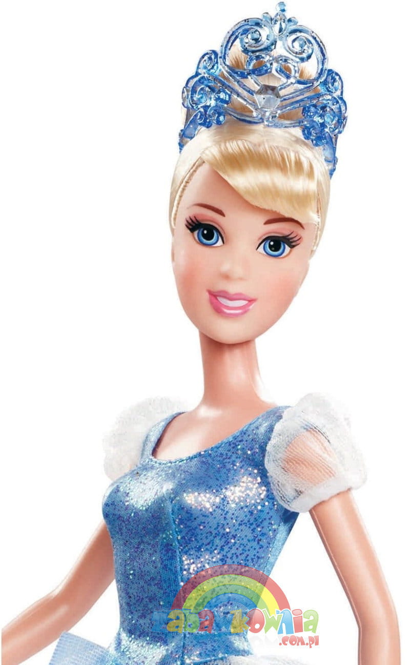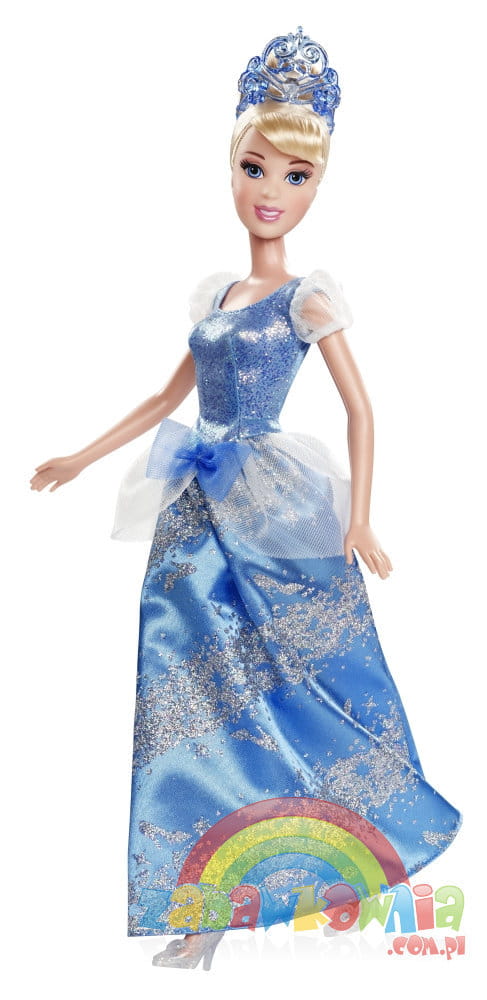 Kopciuszek to blond piękność wyszykowana już na bal księżniczek. Ubrana w swoją wspaniałą błyszcząca niebieską suknie balową z diademem na głowie wygląda olśniewająco. Ma też cudowne kryształowe pantofelki.