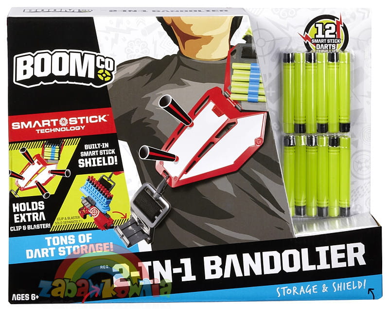 Bandolier to pas który będzie stanowić niesamowicie wygodne wyposażenie gracza BOOMco. Stanowi nośnik na dodatkowe rzutki, tarczy do przechwotywania strzałek przeciwnika i miejsce, do którego doczepić można swój blaster. Pas wyposażony jest w dwanaście rzutek przechowywanych w poręcznych magazynkach.
