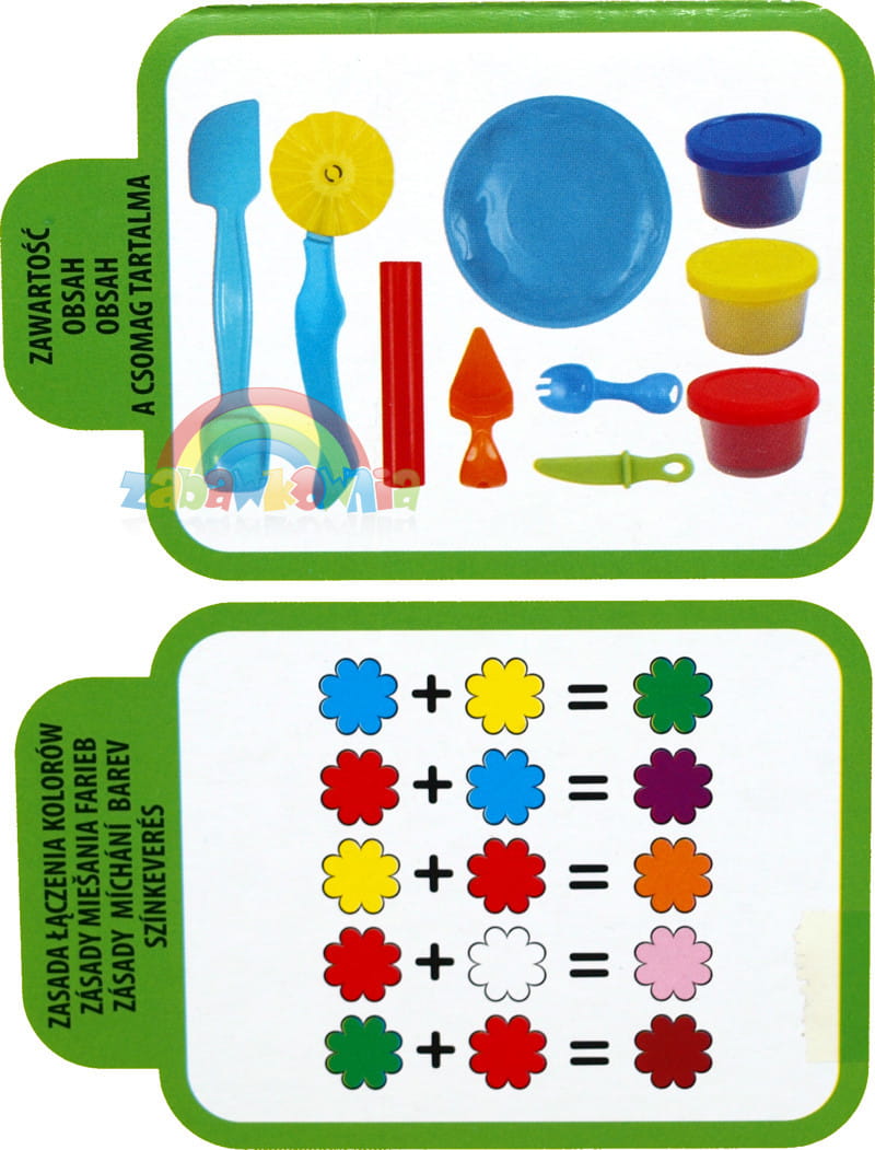 Pięć 60 gramowych tub ciastoliny wraz z 26 (wszystkie elementy na zdjęciu powyżej) elementowym zestawem do zabawy dla maluchów. Dodatkowa każda przykrywka posiada wzornik do wykonania ciastolinowej płaskorzeźby.