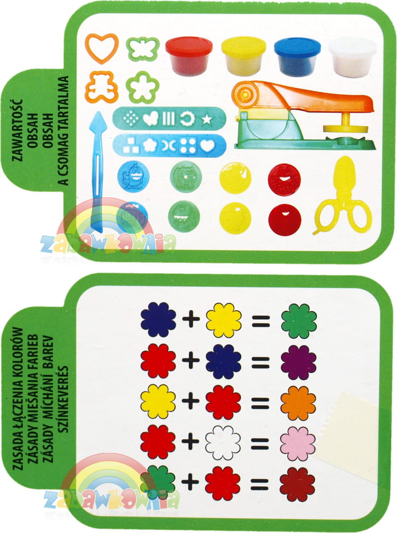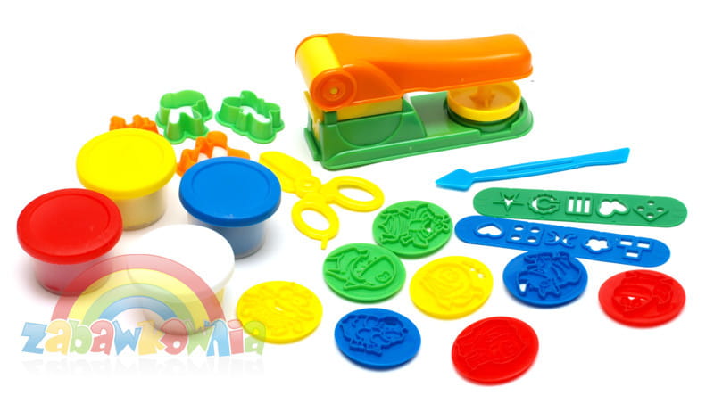 Cztery 40 gramowe tuby ciastoliny. Efektowne kolory i foremki w kształcie zwierzątek zapewnią dziecku wspaniałą zabawę. Do zestawu dołączona została wyciskarka oraz całą moc dodatkowych akcesorii (razem 21 elementów). Dzieci uwielbiają zabawę masami plastycznymi, a dodatkowe elementy takie jak foremki w różnych kształtach, wyciskarka czy medaliki do praski sprawią, że radość zabawy jest jeszcze większa. Dzięki nim można stworzyć fantazyjne wzory i kształty. Dziecko podczas takiej zabawy rozwija swoje zdolności plastyczne i kreatywnego myślenia. Uczy się jak powstają nowe kolory przy mieszaniu barw podstawowych.