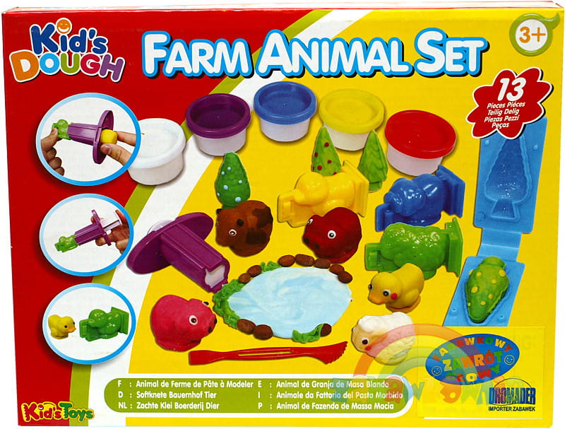 Świnka, krówka, bara i kurczaczek. takie zwierzątka wyczarujesz z ciastoliny dzięki temu zestawowi. Znajdziesz tu również foremkę do robienia drzewek. Zobacz sam jak łatwo wykonać ciastolinowe zwierzaki. Formy zwierzątek są tak skonstruowane, że ciastolinę można wcisnąć do nich specjalną dołączoną strzykawką. Wystarczy mocno nacisnąć i zwierzątko gotowe. W zestawie znajdziesz aż pięć tubek kolorowej ciastoliny.