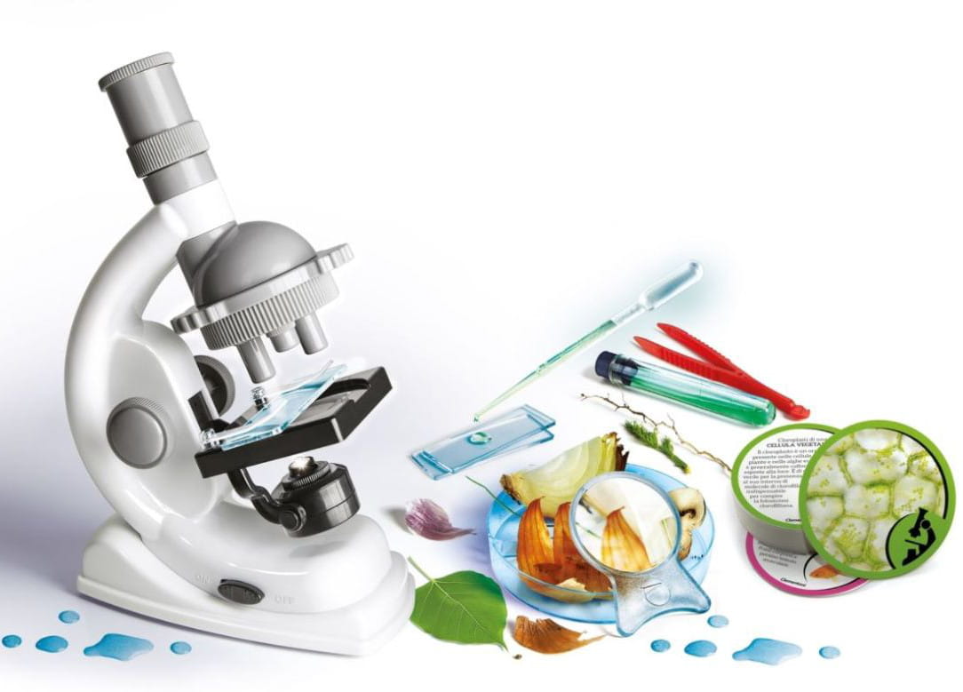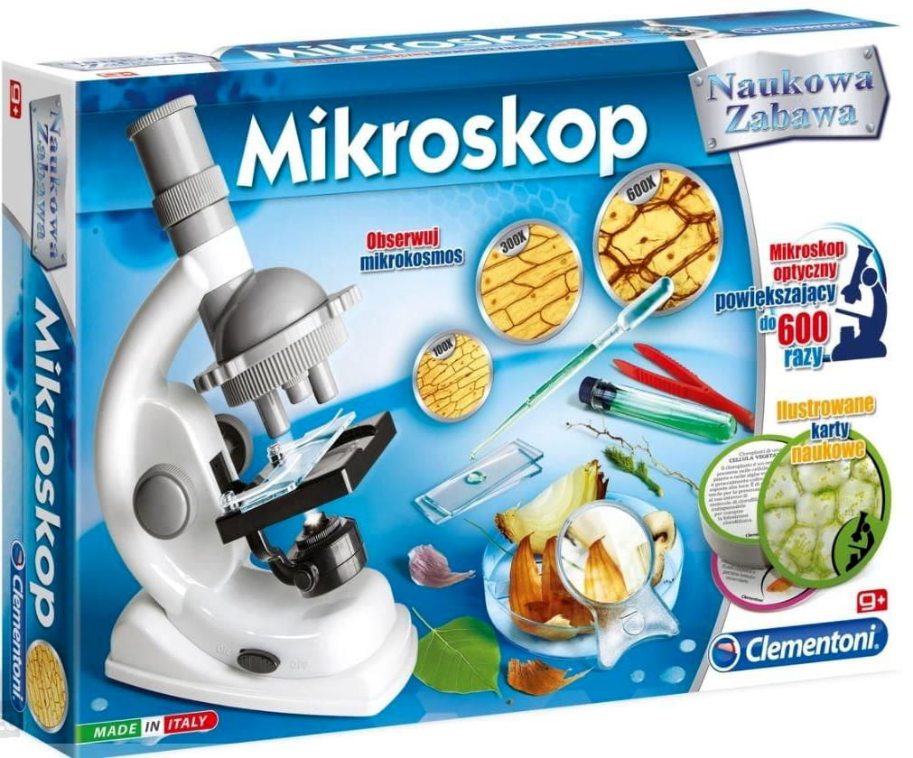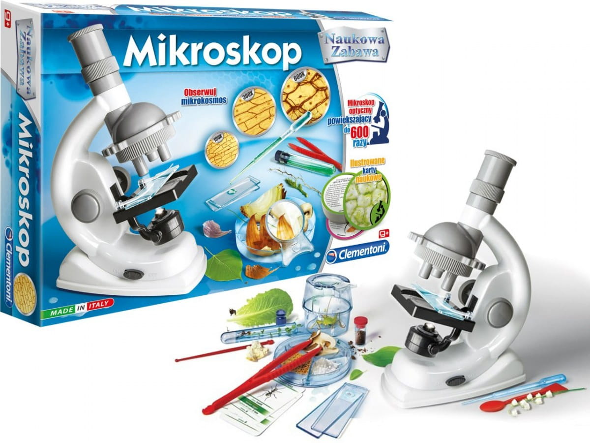 Mikroskop w zestawie z akcesoriami doświadczalnymi. Mikroskop pozwala na powiększenia od 100x do 600x.