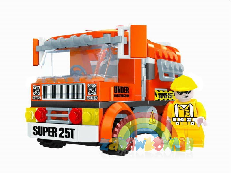 Zbuduj wspaniały pomarańczowy samochód służb oczyszczania miasta. Auto posiada otwierane drzwi i duże lusterka ruchome tak jak prawdziwe samochody ciężarowe.