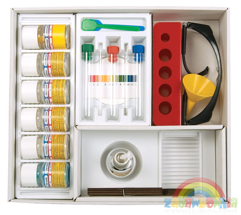 Zestaw „Laboratorium Chemiczne", pozwoli Ci poznać tajniki chemii i odkryć mnóstwo ciekawych substancji chemicznych, także tych znajdujących się w Twoim otoczeniu. Poprzez zmieszanie różnych związków chemicznych będziesz otrzymywać nowe substancje, ucząc się przy okazji o zachodzących reakcjach chemicznych. W miarę nabywanego doświadczenia dowiesz się, że praktyczne zastosowanie wiedzy chemicznej jest niezwykle kreatywne i polega na tworzeniu zupełnie nowych substancji: tworzyw sztucznych, syntetycznego kauczuku, włókien, lekarstw, farb, barwników itp.