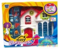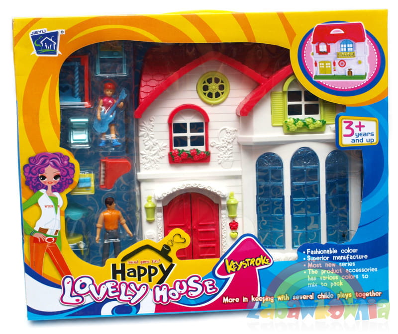 Bardzo ładnie wykonany domek dla lalek z otwieranymi drzwiami i balkonikiem. Przy drzwiach wejściowych zainstalowany jest prawdziwy dzwonek. Na wyposażeniu jest komplet mebelków do różnych pomieszczeń wraz z laleczkami.