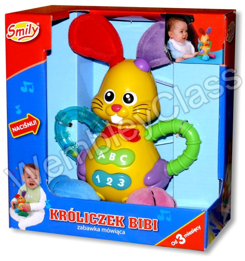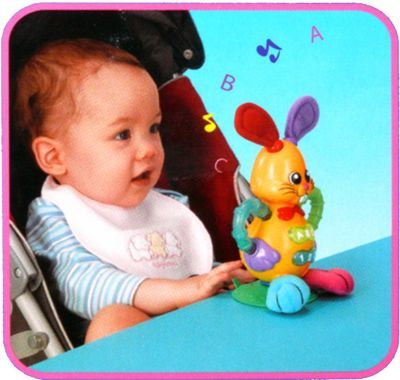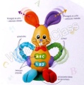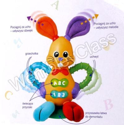 Śliczna grzechotka-zabawka z łatwo dołączaną przyssawką. Dzieci będą miały mnóstwo radości, gdy wesoły króliczek zacznie wydawać wesołe odgłosy i świecić kolorowymi światełkami. Króliczek potrafi też grać muzykę i mówić po polsku: "jeden, dwa, trzy - to liczby...", "a, b, c - to literki"króliczek ma duże i kolorowe,welurowe uszy, które zachęcają maluchy do zabawy - pociągnij za nie, a królik wyda ciekawe dźwięki.