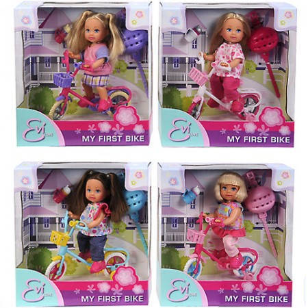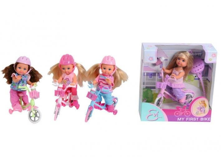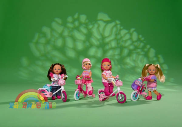 Evi ma teraz swój własny rowerek. Dla bezpieczeństwa możesz jej założyć kask. Rowerek ma koszyczek na drobiazgi, a gdy zachce się jej pić ma do dyspozycji bidon na napoje. Rower posiada boczne kółka jakie zwykle montowane są w dziecinnych rowerkach. Naucz swoją Evi jeździć samodzielnie na jej nowym rowerze.