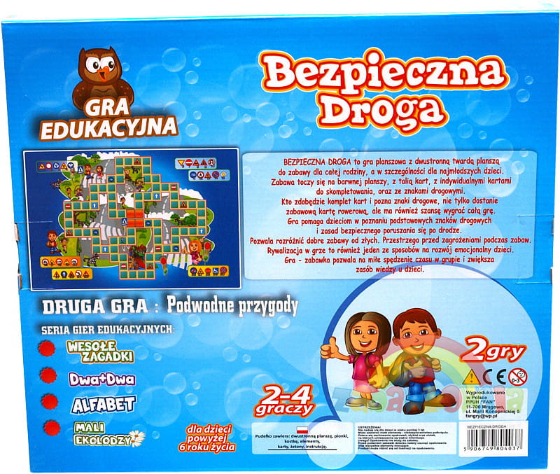 Bezpieczna Doga to gra planszowa z twardą planszą z dwustronnym nadrukiem. Gra przeznaczona dla całej rodziny, ale przede wszystkim dla najmłodszych dzieci.