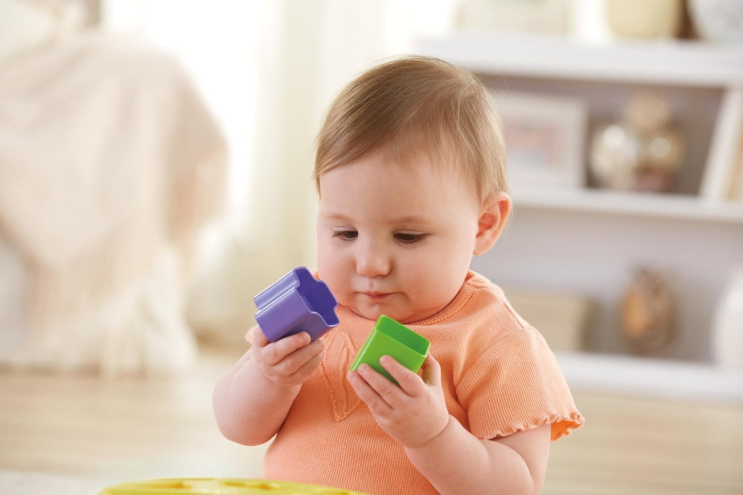 Dziesięć jaskrawych klocków można wrzucać do otwartego wiaderka lub przez pokrywkę umożliwiającą sortowanie ich według kształtów. Napełnianie wiaderka klockami, wyrzucanie ich i rozpoczynanie całej zabawy na nowo doskonali koordynację oko-ręka oraz inne wczesne umiejętności. Następnie dziecko może przejść do segregowania i układania kloców w stosiki, dzięki czemu nauczy się rozpoznawać i dopasowywać kształty!
