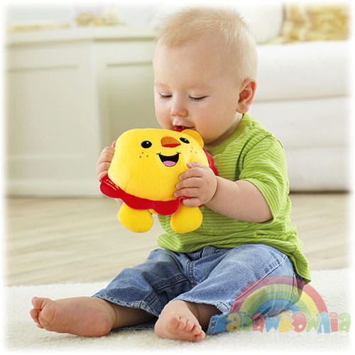 Śliczna maskotka w kształcie lwa, który reaguje na potrząsanie, tarmoszenie i ściskanie wydając z siebie odgłosy śmiechu, wesołe okrzyki i zabawne odgłosy zwierząt. Intensywne kolory i pluszowa faktura zachęca dzieci do zabawy, a one żywiołowo będą reagować na okrzyki jakie lew będzie z siepie wydawać.