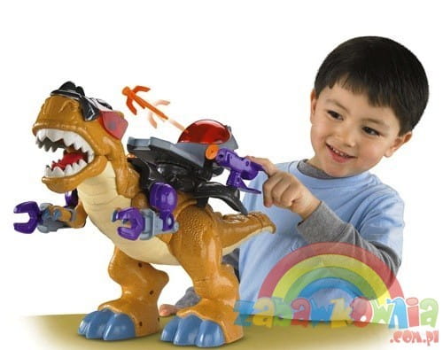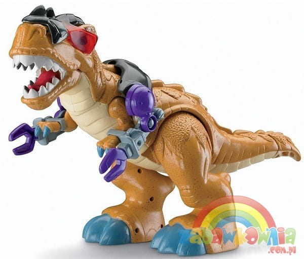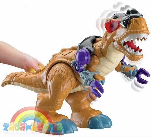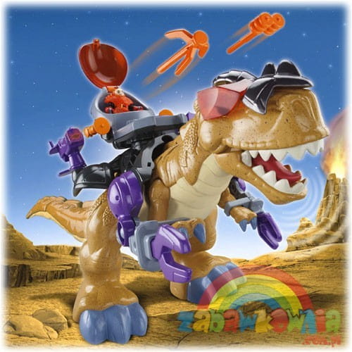 Fantastyczny mega duży Tyranozaur T-Rex! Dinozaur porusza się i przenosi nas w fantastyczny, prehistoryczny świat. Posiada nowoczesną broń, choć sam pochodzi z prehistorii. T-Rex posiada napęd, wydaje niesamowite dźwięki i posiada zdejmowane uzbrojenie, a wszystko to sprawia, że jest on wyjątkowo groźny, a zabawa jeszcze lepsza. T-Rex ma na grzbiecie przycisk, dzięki któremu rusza szyją, otwiera paszczę i wydaje przerażające dźwięki.