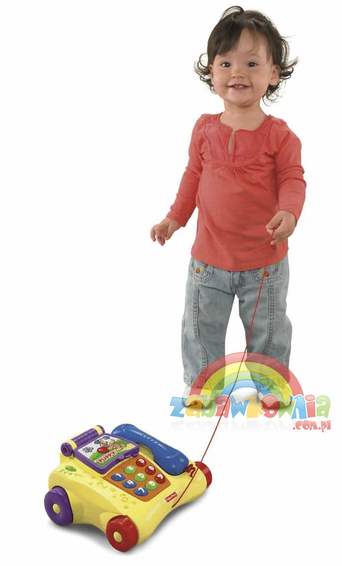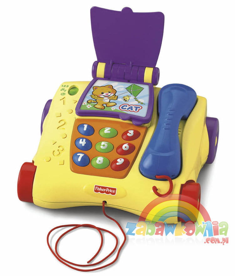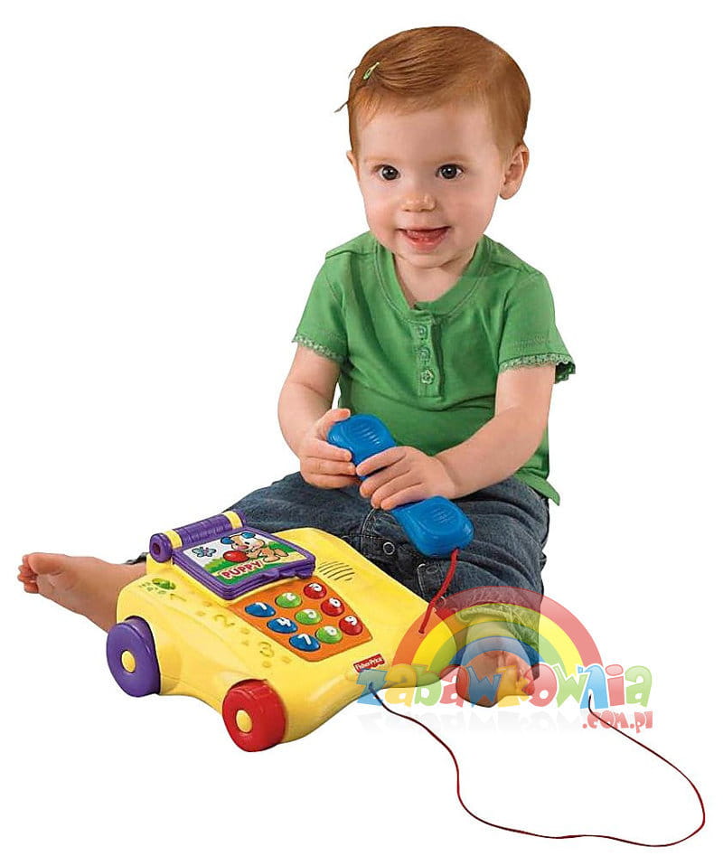 Dziecko może bawić się telefonem ciągnąc go na sznurku.