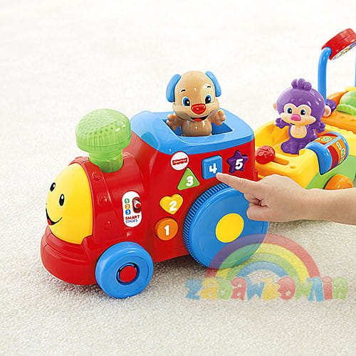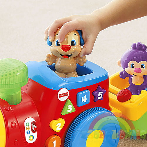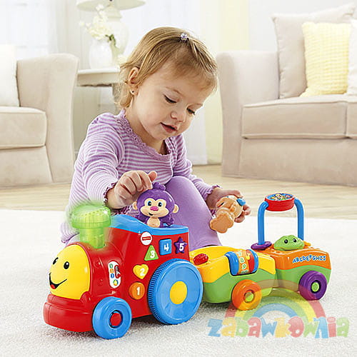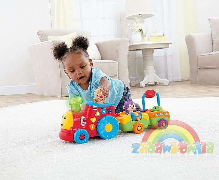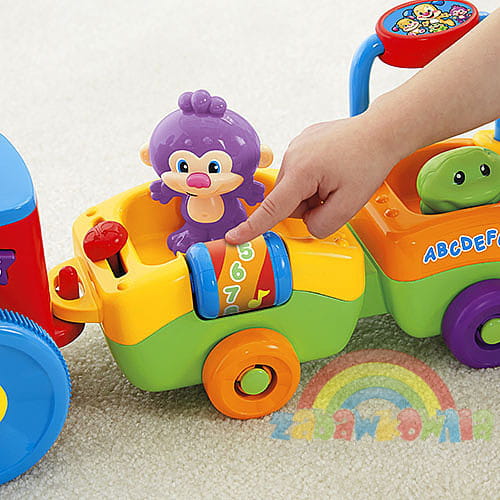 Ta edukacyjna lokomotywa z dwoma wagonikami posiada ponad 50 piosenek, powiedzonek i zabawnych dźwięków. Dziecko przycisnąć podświetlany komin i aż pięć kolorowych guziczków w różnych kształtach włączając dźwięki, piosenki i słuchać o cyferkach, literkach, alfabecie, kolorach, kształtach, usłyszeć powitania i przeciwieństwa.