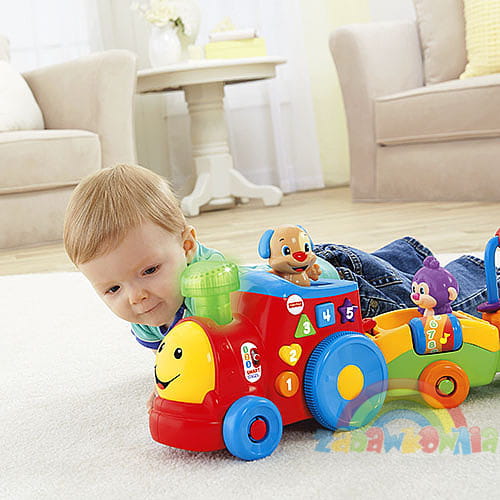 Lokomotywa posiada napęd, który pozwala jej samodzielnie jechać ciągnąc za sobą wagoniki, a dzieciaczki będą za nim raczkować próbując ją dogonić.