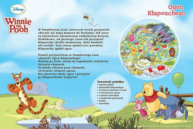 Zadaniem graczy jest przejść Stumilowy Las szukając ogona i złożyć jego puzzlowe elementy, by donieść ogon do domku Kłapouchego. Komu się to powiedzie - wygra rozgrywkę. W odróżnieniu do większości gier planszowych samodzielnie wybierzesz ścieżki, którymi będą podążać Kubuś, Maleństwo, Prosiaczek i Królik. Ale w drodze spotkają was kolorowe żetony-chmurki – żeby móc rozpocząć dalszą wyprawę i zdobyć część ogona, musicie odnajdywać takie same obrazki na planszy. Za każdą odkrytą parę otrzymacie jeden element. Jeśli nie uda wam się dopasować chmurek, z odkrytych obrazków skorzystają przeciwnicy. Szukajcie Nory Gofera, to tajny skrót na drugą stronę!