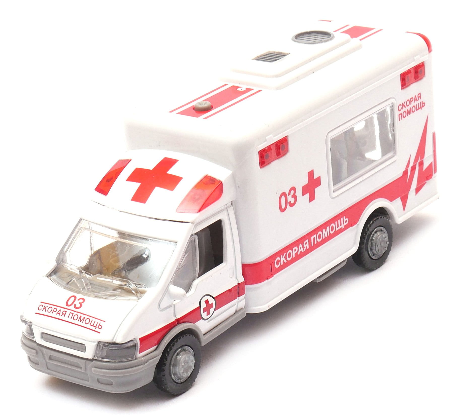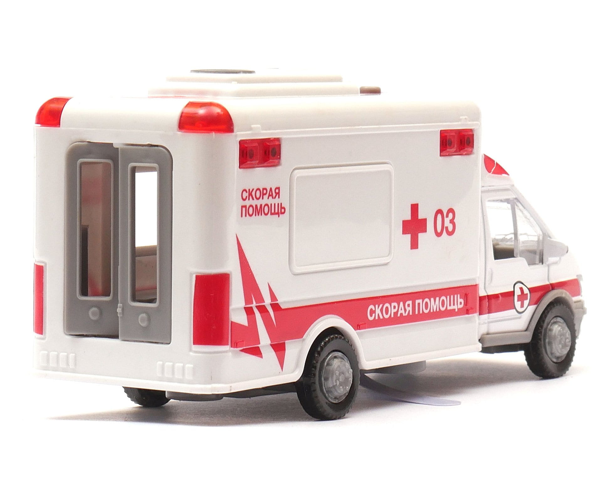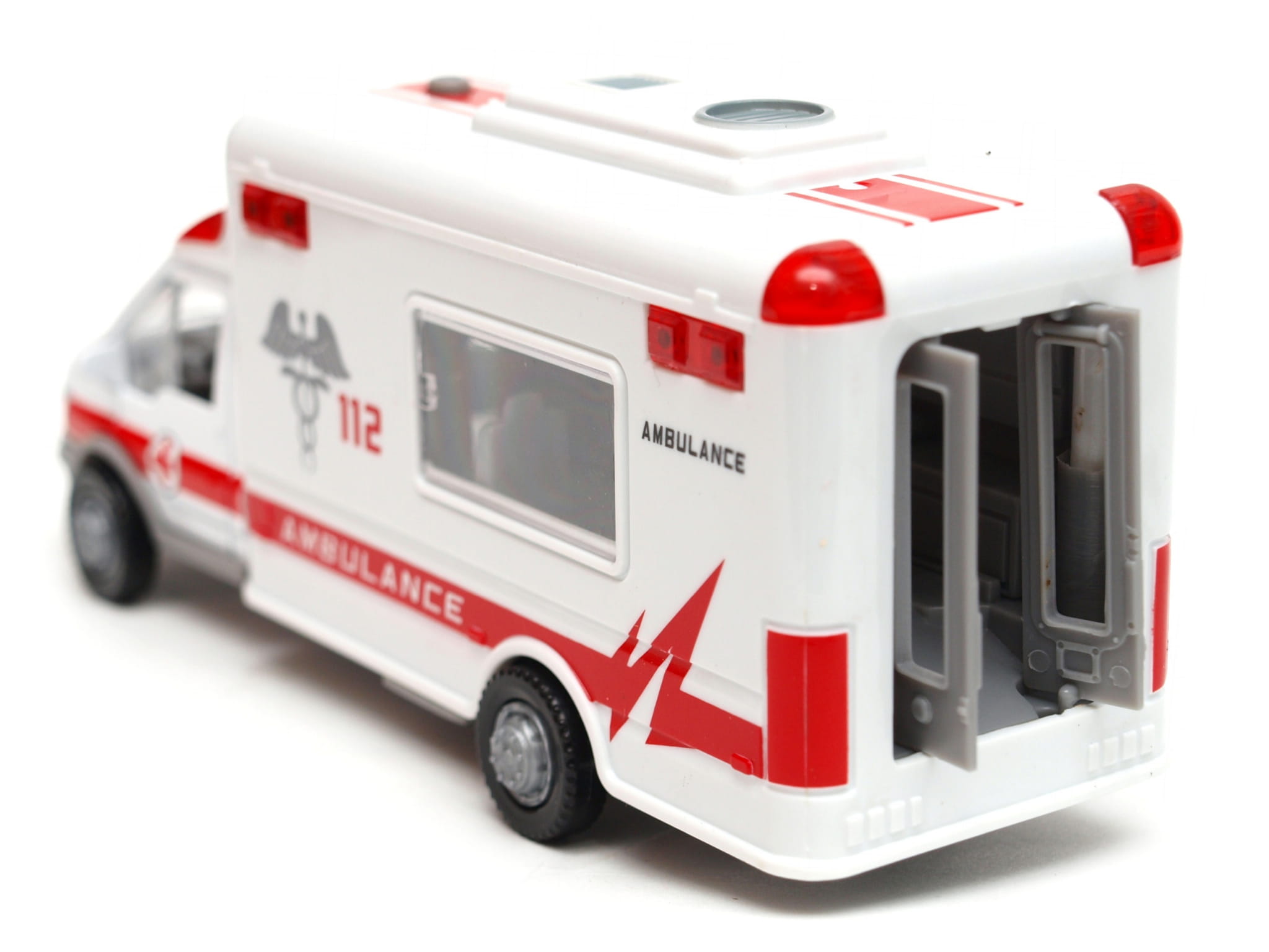 ie wykonany metalowo - plastikowy model samochodu karetki pogotowia. Autko posiada przycisk włączający dźwięk syreny i światło ostrzegawcze "koguta", a także otwierane drzwi .