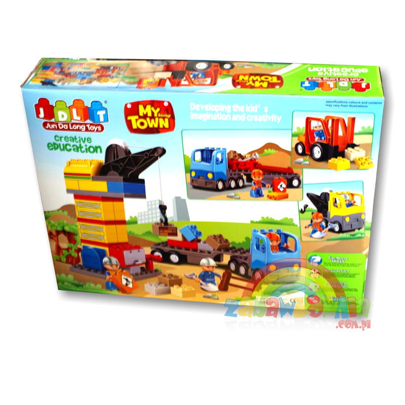 Wysokiej jakości klocki marki JDLT z serii My Busy Town, dla dzieci już od 3 roku życia. Zestaw pozwala dziecku na zabawę w plac budowy. Znajdziemy tam między innymi klockowe pojazdy budowlane takie jak samochód ciężarowy z lawetą, betoniarka i wózek widłowy. Można też zbudować dźwig. W zestawie znajdują się również figurki robotników, akcesoria budowlane i klocki konstrukcyjne. Ciekawe wzornictwo i duża ilość klocków zapewni dziecku wiele godzin kreatywnej zabawy.