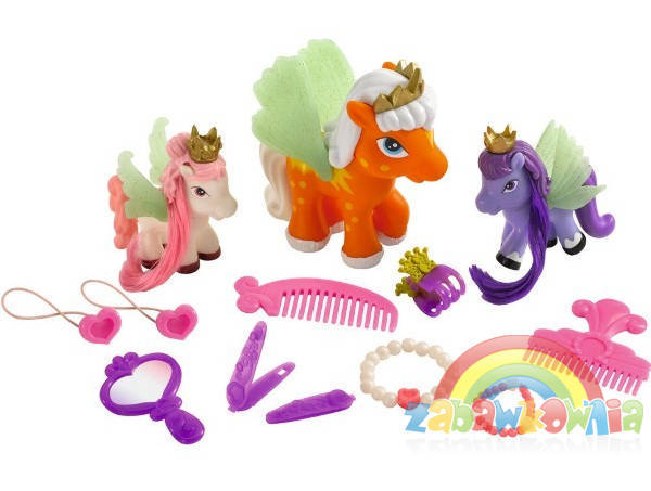 - dwa mniejsze koniki Filly: biały z różowa grzywą i fioletowy z fioletową grzywą.