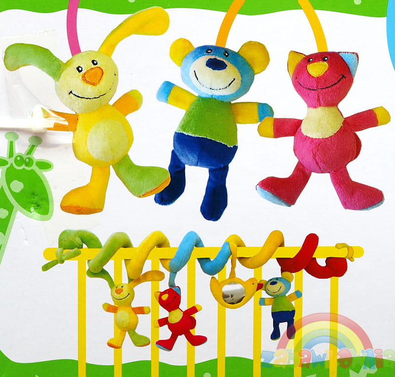 Kolorowe mięciutkie zabawki z ukrytymi w ich wnętrzu grzechotkami są zamocowane na spirali, którą z łatwością da się zamontować na poręczy wózeczka lub łóżeczka. Na końcach sprężynki znajdują się troczki, którymi można ją przywiązać.