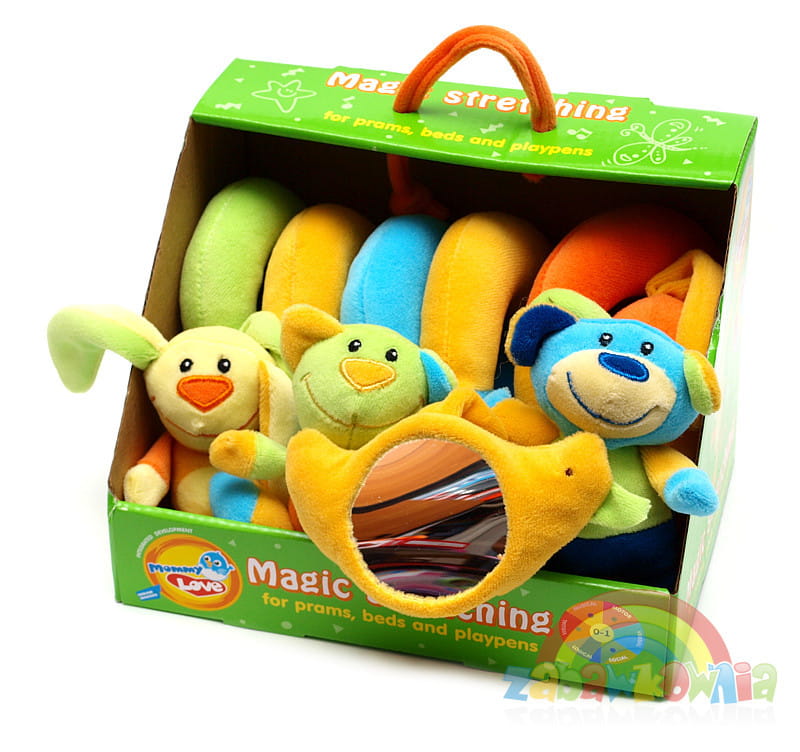 Na spirali zamocowane są trzy maskotki kolorowych zwierzątek: kotka, pieska i królika oraz bezpieczne lusterko. Maluchy uwielbiają się przyglądać zmieniającym się obrazom w zwierciadełku.