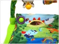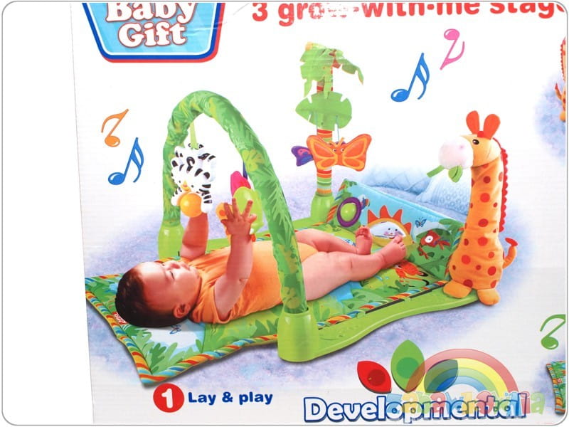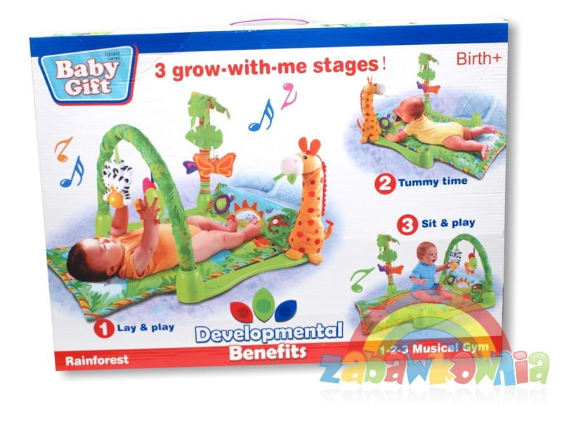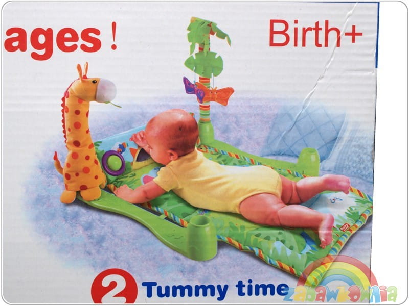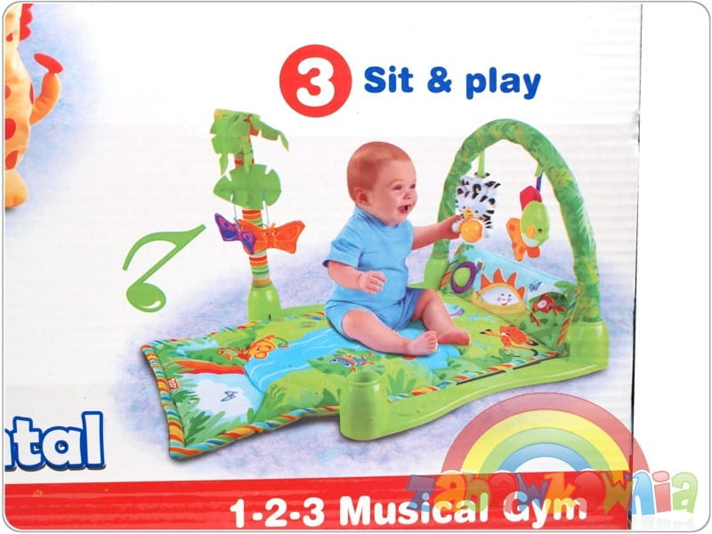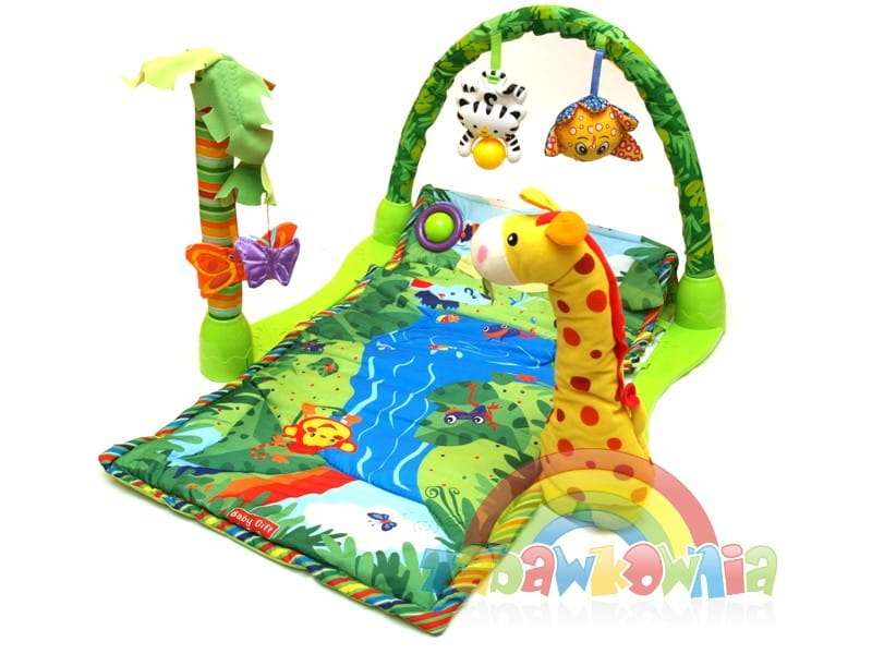 Piękna kolorowa mata z dużą ilością elementów, które zainteresują malca. Posiada miękki materacyk ślicznie zdobiony, pałąk, na którym można zawieszać zabawki, miękką palmę i żyrafę, do której również można zaczepiać zabawki. Mata posiada grzechotkę i bezpieczne lusterko, a do zestawu dołączono trzy zawieszane zabawki: grzechotkę kotka z pozytywką uaktywnianą wstrząsem, miękką grzechotkę gwiazdkę oraz miękkie kolorowe motylki.