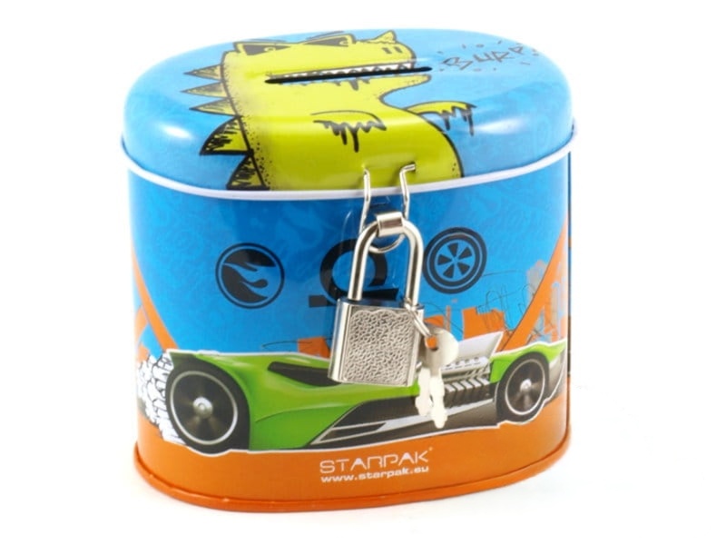 Do skarbonki może wrzucać wszystkie zebrane drobniaki, kłódeczka z kluczykiem da mu poczucie bezpieczeństwa.