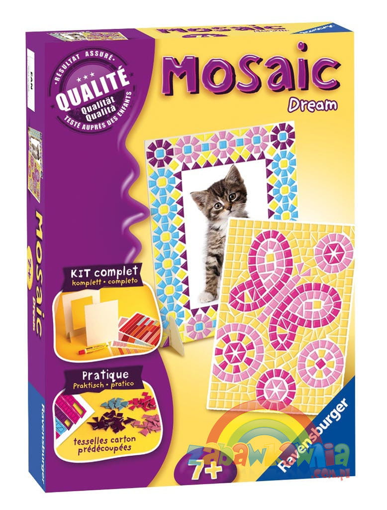Mozaika jest klasyczną techniką zestawiania ze sobą poszczególnych elementów o różnych kształtach i kolorach, z których powstają konkretne obrazy. Opakowanie zwiera plansze z z pięcioma różnymi kształtami w różnych kolorach: kwadrat, trapez równoramienny, trapez prostokątny, trójkąt prostokątny, trójkąt równoramienny.
