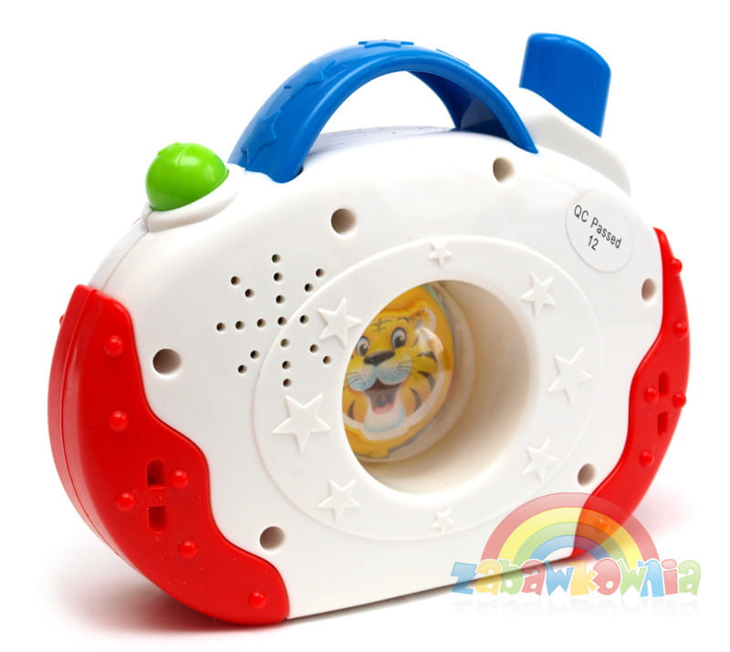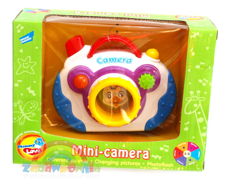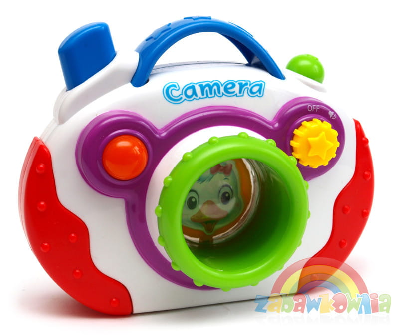 Kolorowy aparacik z zabawnymi dźwiękami, które spodobają się najmłodszym. Po naciśnięciu spustu obrazek w obiektywie obraca się ukazuje na przemian dwa różne obrazki. Podczas, gdy zabawka wydaje dźwięki czerwona lampka zapala się i mruga.