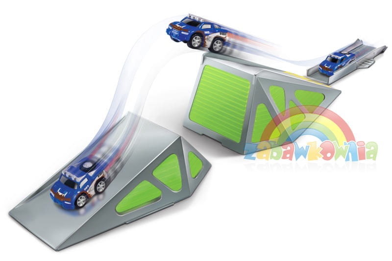 Rozpędzone autko wyskoczy dzięki rampie pokonując duże odległości w powietrzu. Ustaw rampę i zeskok w podpowiedniej odległości i rozpędź swój samochodzik. Czy uda mu się wykonać kaskaderką sztuczkę?