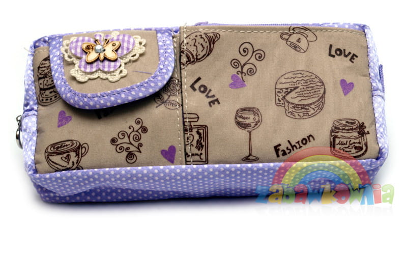 Śliczny piórnik z dodatkowymi kieszonkami, zdobiony motylkiem wykończonym kryształkiem. Posiada dużą komorę, dwie mniejsze kieszonki z frontu i jedna z siatki z tyłu.