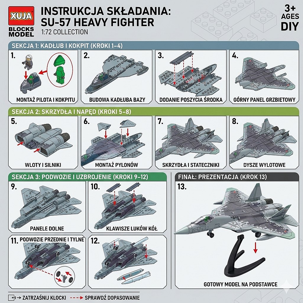 Odkryj fascynujący świat nowoczesnego lotnictwa wojskowego z modelem myśliwca SU-57. Ten unikalny zestaw klocków konstrukcyjnych to idealna propozycja dla każdego pasjonata militariów, który ceni sobie estetykę wykonania i prostotę montażu.
