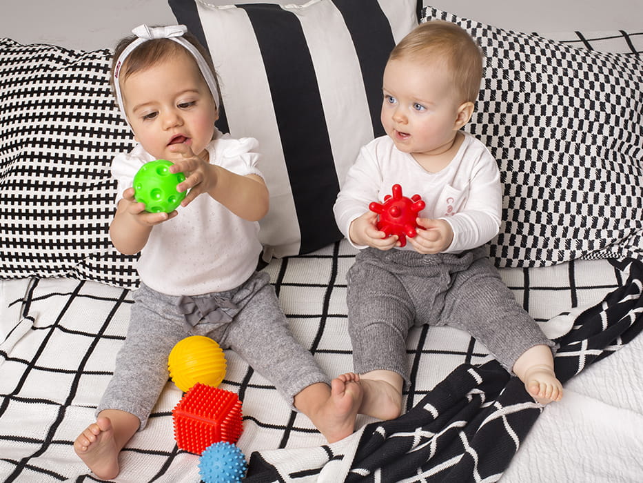 sprawdzają się również w okresie ząbkowania, ponieważ faktury piłek masują dziąsła