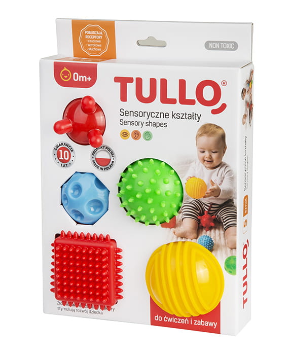 Zestaw pięciu miękkich zabawek sensorycznych przeznaczony do ćwiczeń integracji sensorycznej oraz zabawy. Każda zabawka posiada inny rozmiar i inną fakturę, dzięki czemu dostarcza różnych wrażeń czuciowych.