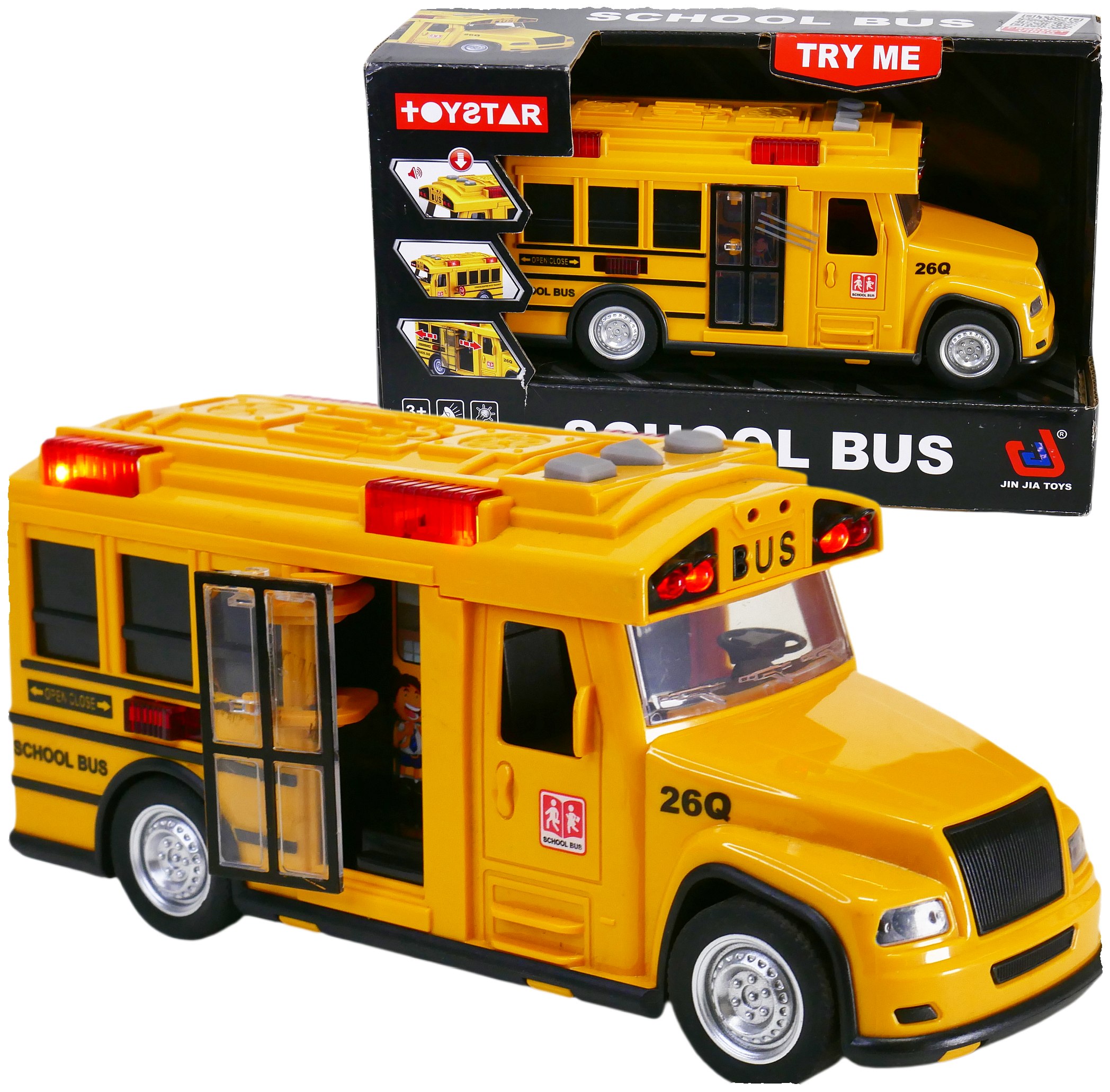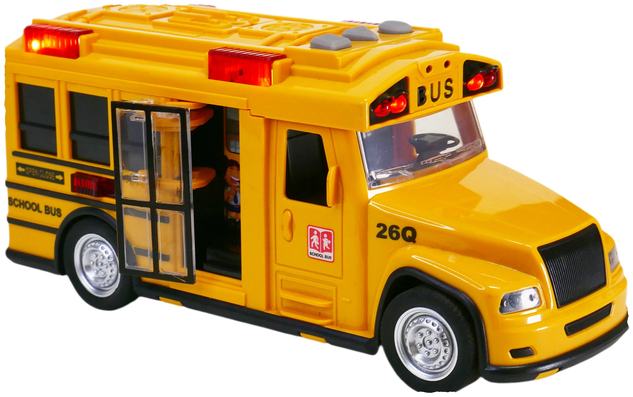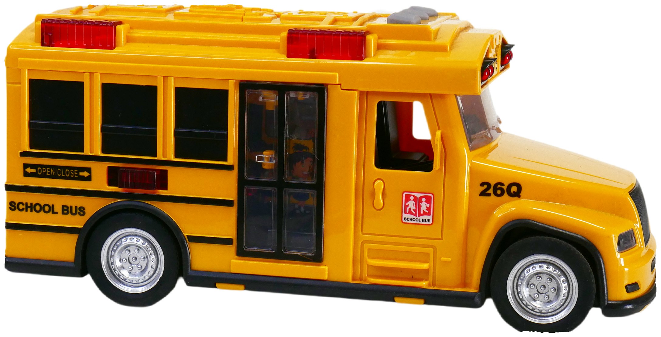 Duży autobus szkolny z otwieranymi drzwiami. Otwierają się one za pomocą suwaka. Autobus wyposażony jest w napęd zamachowy i gumowe opony zwiększając przyczepność do podłoża, a tym samym komfort zabawy. Na dachu autobusu znajdują się przyciski włączające dźwięki i światła. Autobus wykonany został z bardzo wysokiej jakości tworzywa o grubych ściankach zapewniając bezpieczeństwo i trwałość zabawki. Autobus spodoba się małym miłośnikom motoryzacji.