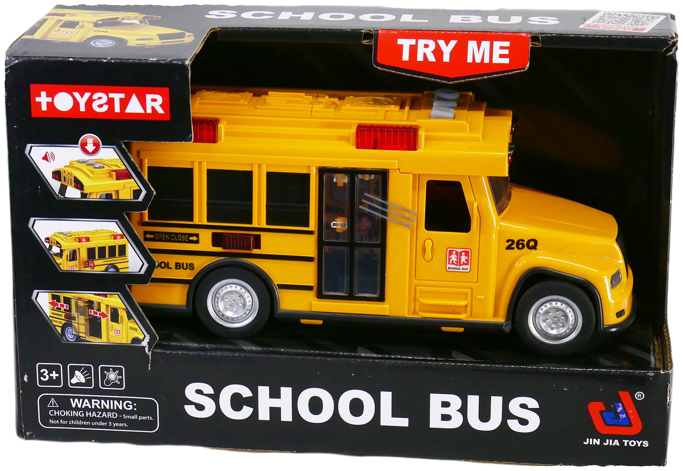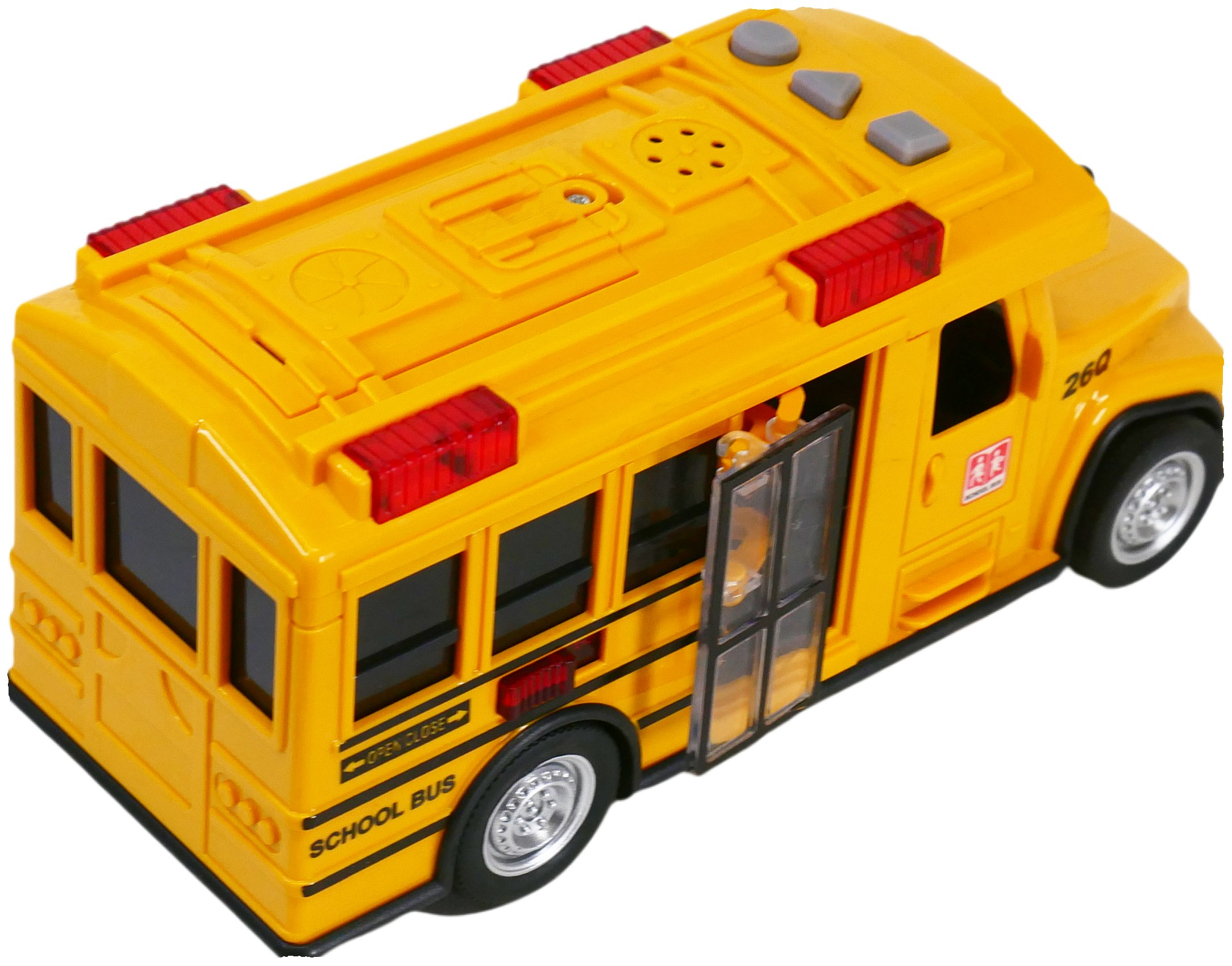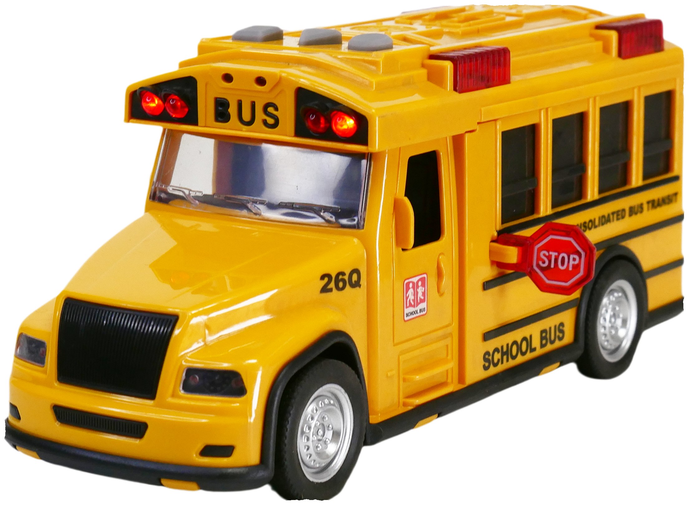 Duży autobus szkolny z otwieranymi drzwiami. Otwierają się one za pomocą suwaka. Autobus wyposażony jest w napęd zamachowy i gumowe opony zwiększając przyczepność do podłoża, a tym samym komfort zabawy. Na dachu autobusu znajdują się przyciski włączające dźwięki i światła. Autobus wykonany został z bardzo wysokiej jakości tworzywa o grubych ściankach zapewniając bezpieczeństwo i trwałość zabawki. Autobus spodoba się małym miłośnikom motoryzacji.