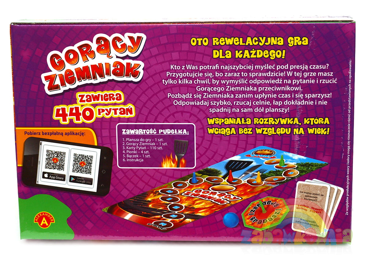 Gra sprawdzi który z graczy jest w stanie szybko myśleć pod presją czasu. W jej trakcie będziesz mieć zaledwie kilka chwil, by podać odpowiedź i pozbyć się Gorącego Ziemniaka oddając go przeciwnikowi. Musisz go oddać nim czas dobiegnie końca i się sparzysz. Gra wymagać będzie od każdego gracza szybkich odpowiedzi, celnego rzucania i pewnego łapania. Rób to wszystko by nie spaść na sam dół planszy. Gra stanowi ciekawą propozycję na grę w towarzystwie bez względu na wiek.