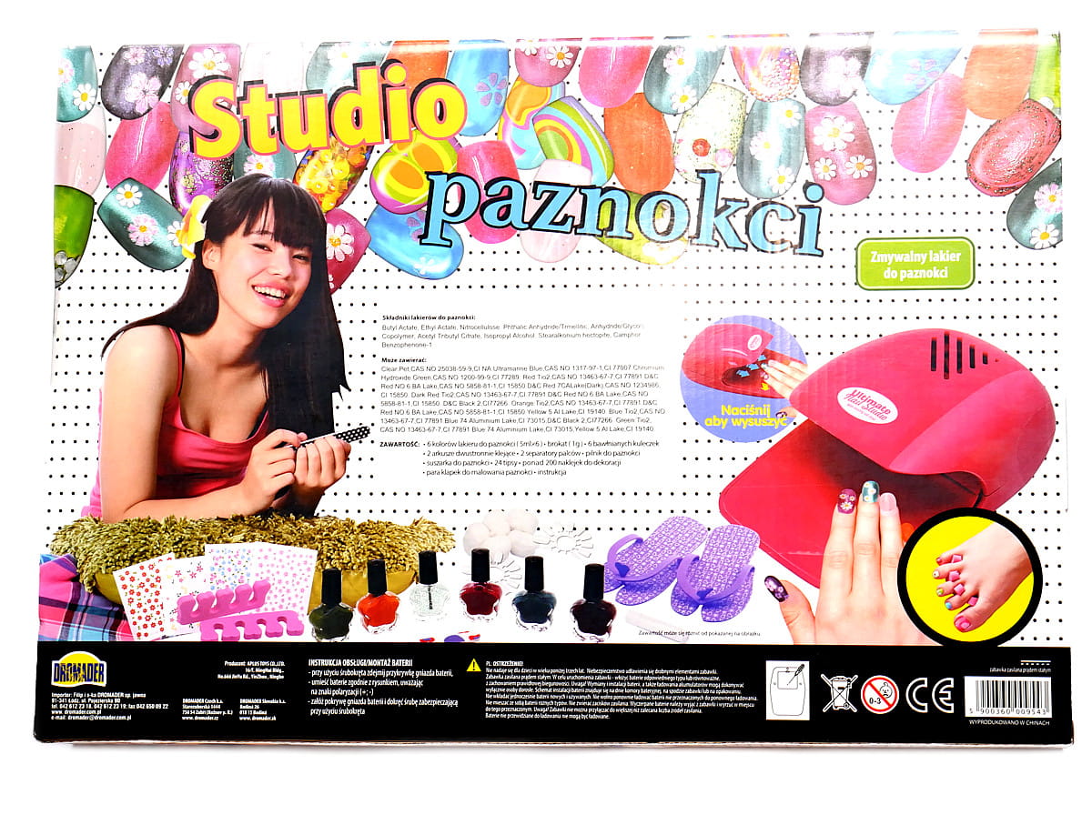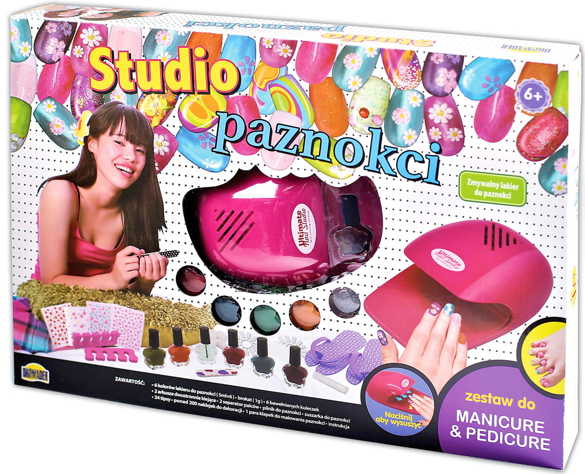 Wykonaj niepowtarzalne paznokcie w niesamowitych brokatowych kolorach. Posługuj się kosmetykami jak prawdziwa stylistka. To ogromny zestaw w kolekcji, na który składa się 6 kolorów lakierów, tipsy, naklejki i suszarka do paznokci. W tym dużym zestawie zamkniętym w ogromnym pudełku znajdziesz wszystkie niezbędne elementy zawodowej manicurzystki. Ozdobisz paznokcie kolorowymi naklejkami, pomalujesz lakierem lub pokryjesz błyszczącym brokatem.