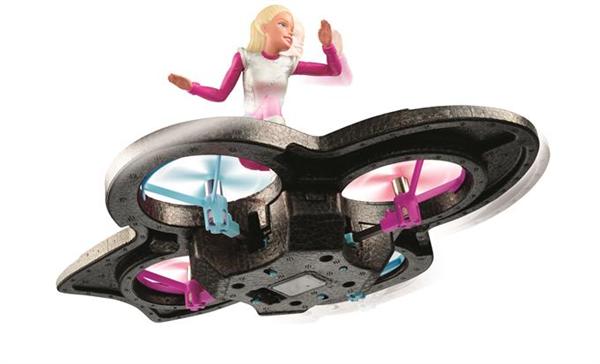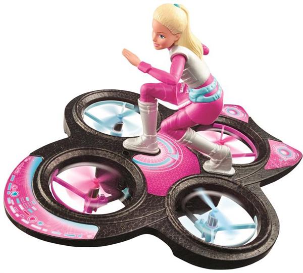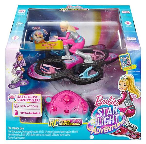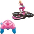 Inspirowana filmem „Barbie™: Gwiezdna Przygoda” Sterowana latająca Barbie® NAPRAWDĘ LATA! Przy pomocy jednego przycisku Barbie automatycznie wystartuje i wyląduje, a jej lot łatwo reguluje się stylowym pilotem z joystickiem i suwakiem wysokości. 4 śmigła pozwolą wykonać 3 zaprogramowane sztuczki zaraz po wyciągnięciu z pudełka! Figurka Barbie® (przymocowana na stałe) ma na sobie różowy kombinezon ze srebrną kamizelką, niebieski pasek i srebrzyste buty. Czarną deskę zdobią kolorowe akcenty oraz różowe śmigła. Zestaw zawiera lewitującą deskę z figurką Barbie® oraz pilota zdalnego sterowania.