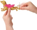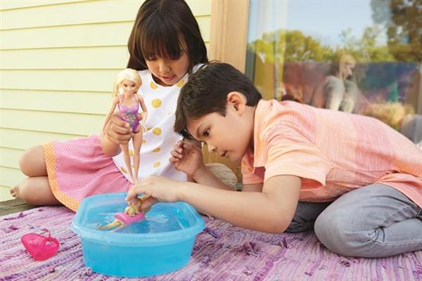 Do zabawy z pieskiem w basenie zaprasza jak zwykle uśmiechnięta Barbie®. Gdy tylko pieska włożysz do basenu napełnionego wodą możesz nacisnąć na jego grzbiet, a zachwycisz się jego umiejętnościami pływackimi. Basen Barbie został wyposażony w trampolinę. Naucz skakać z niej pieska, a może Barbie też się skusi na oddanie kilku ekscytujących skoków. Lalka Barbie® na czas kąpieli ubrała się w kwiecisty, zmieniającym kolor kostium kąpielowy z różową narzutką. W wodzie zmienia on kolor z fioletowego w różowy!
