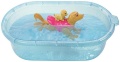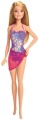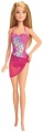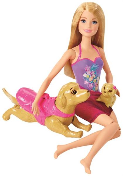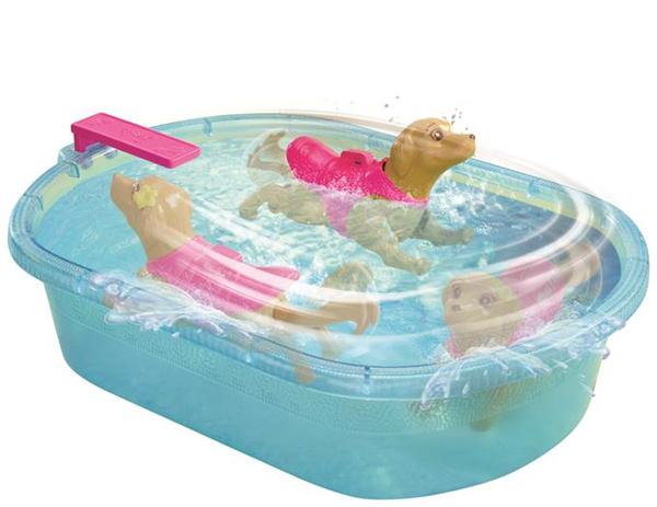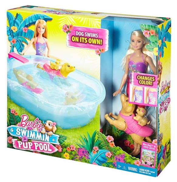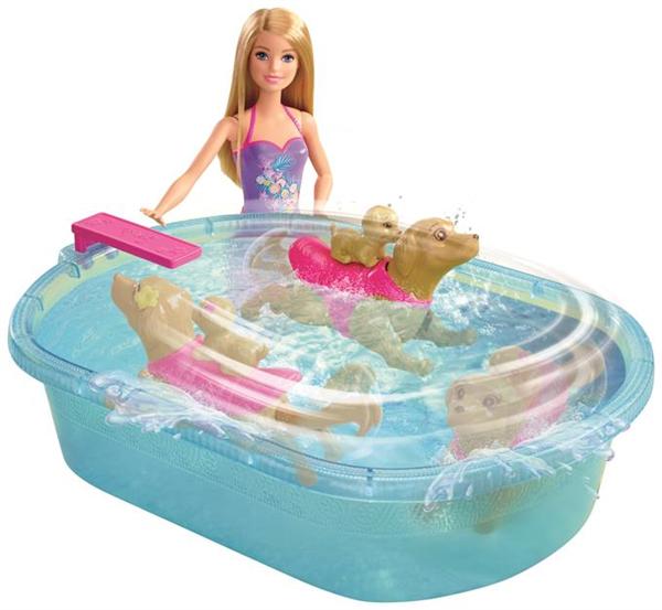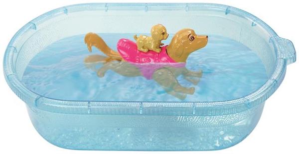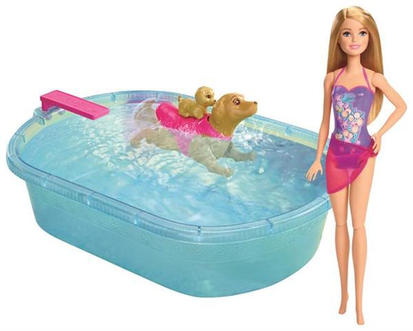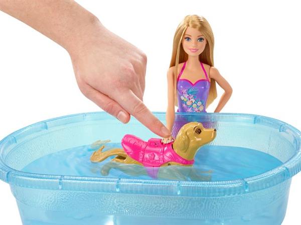 W zestawie lalka Barbie w plastikowym stroju kąpielowym zmieniającym kolor, basen z trampoliną, pływający piesek i szczeniaczek.