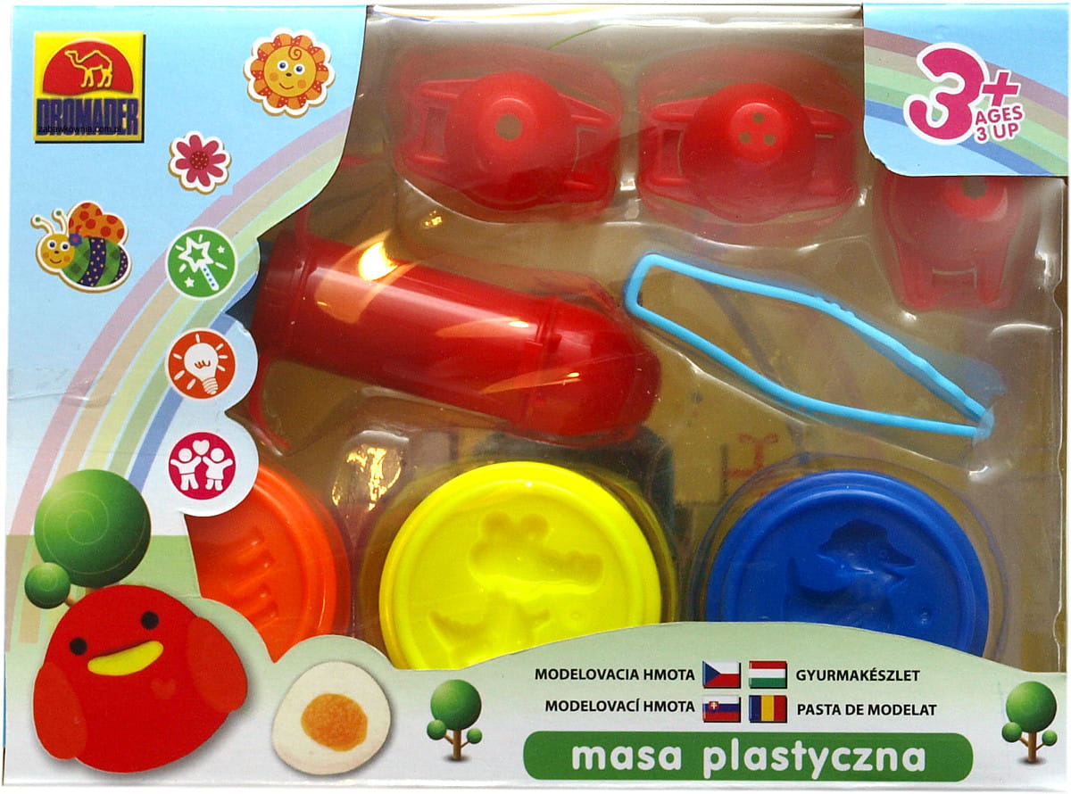 Cztery 40 gramowe tuby ciastoliny. Efektowne kolory i foremki w kształcie zwierzątek zapewnią dziecku wspaniałą zabawę. Do zestawu dołączona została wyciskarka oraz całą moc dodatkowych akcesorii (razem 21 elementów). Dzieci uwielbiają zabawę masami plastycznymi, a dodatkowe elementy takie jak foremki w różnych kształtach, wyciskarka czy medaliki do praski sprawią, że radość zabawy jest jeszcze większa. Dzięki nim można stworzyć fantazyjne wzory i kształty. Dziecko podczas takiej zabawy rozwija swoje zdolności plastyczne i kreatywnego myślenia. Uczy się jak powstają nowe kolory przy mieszaniu barw podstawowych.