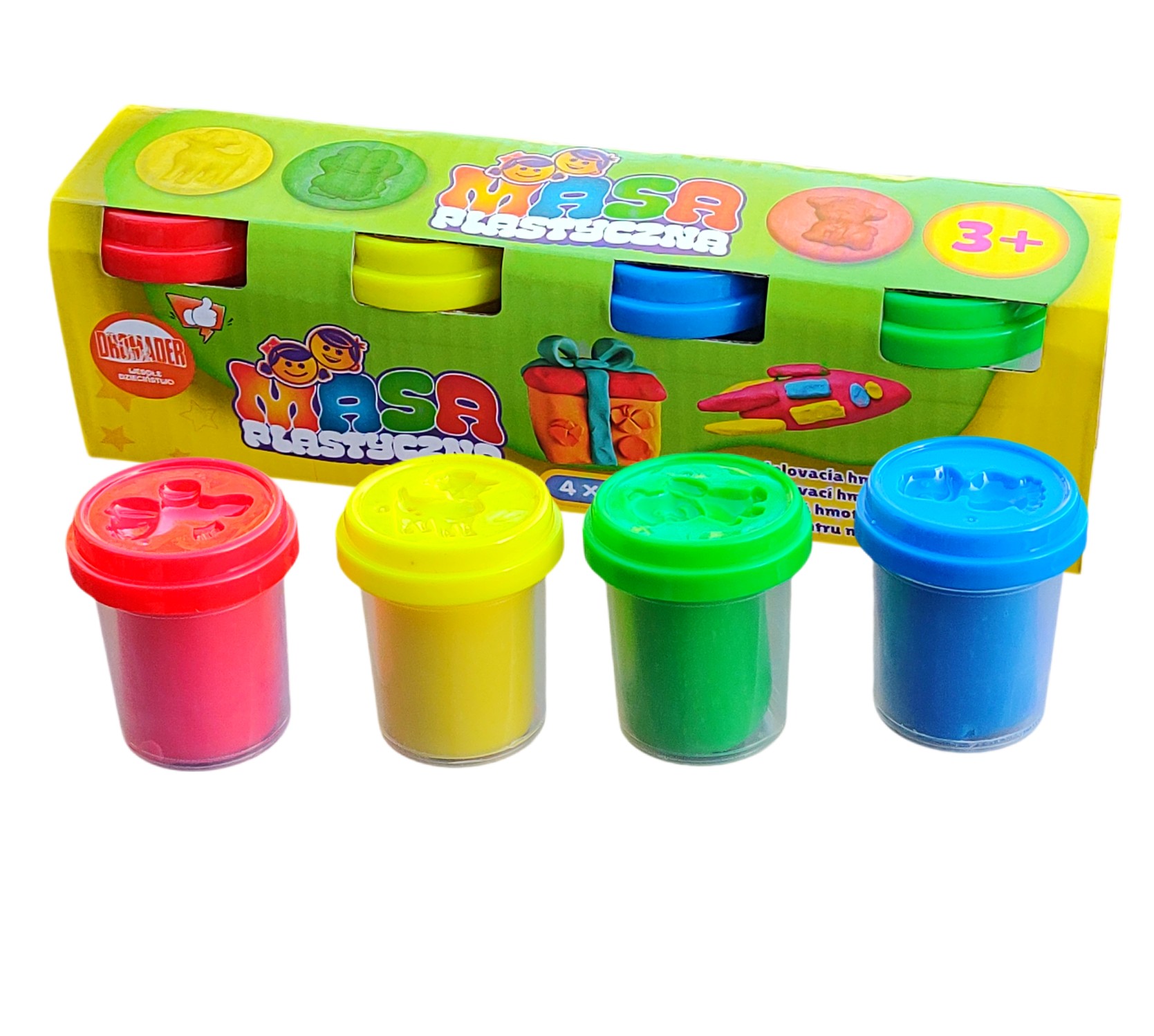 Cztery 50 gramowe tuby ciastoliny, które będą znakomitym uzupełnieniem zestawów dla dziecka. Jeszcze więcej ciastoliny - jeszcze więcej zabawy. W zestawie znajdują się cztery bajeczne kolory. Dodatkowa każda przykrywka posiada wzornik do wykonania ciastolinowej płaskorzeźby. Ciastolina jest wysokiej jakości, a oto sposób co zrobić w przypadku wyschnięcia ciastoliny: ciastolinę zawiń w wilgotną szmatkę na około 1/2 godziny i gotowe można bawić się dalej.