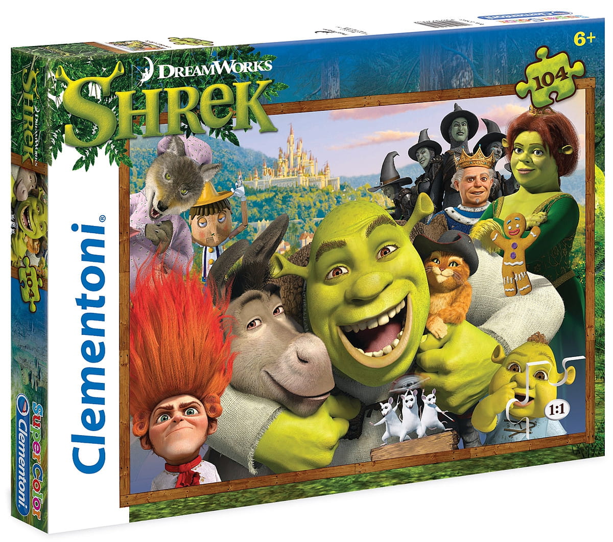Puzzle o niezwykle wyrazistych kolorach serii SUPER COLOR Clementoni zapewnią dzieciom zabawę z bohaterami z filmu o wielkim ogrze i przeuroczym ośle. Puzzle składają się z kolażu obrazków, na których znajdziemy najbardziej charakterystyczne postaci z bajki.