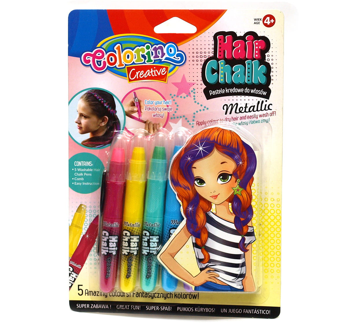 Czas na prawdziwe szaleństwo! Stwórz szalone kolorowe fryzury, których pozazdroszczą Ci koleżanki. Do dyspozycji masz pięć fantastycznych kolorów zamkniętych w poręcznych sztyftach, którymi z łatwością zabarwisz kosmyki włosów. Taki zestaw umożliwia wykonanie zwariowanych stylizacji, szalonych fryzur i pomysłowych uczesań. Weź zestaw do rąk i zostań prawdziwą stylistką.