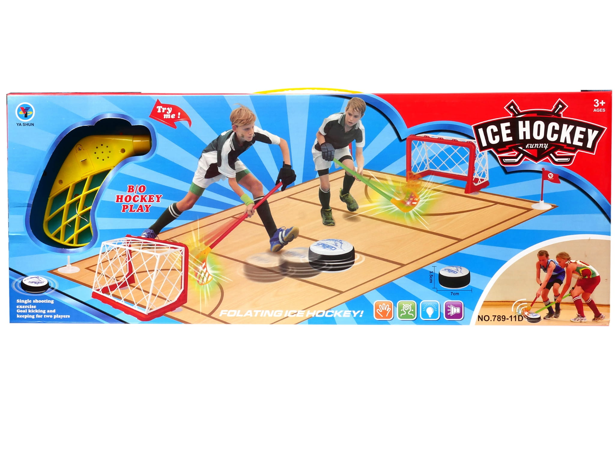 Krążek, który unosi się w powietrzu na poduszce powietrznej niczym UFO. Dzięki temu płynnie szybuje po podłodze jakby ślizgał się bez udziału tarcia. W zestawie znajdują się dodatkowo dwie bramki i kijki, które pod wpływem wstrząsów wydają dźwięki i rozświetlają się światłe uatrakcyjniając zabawę. Taka nowoczesna gra w hokej na lodzie to ciekawa propozycja dla najmłodszych dzieci, które na pewno będzie bawiła takim latającym obiektem, a migające światełka uatrakcyjniać będą zabawę. Wokół krążka jest gąbkowy zderzak zabezpieczający ją jak i obiekty, o które się będzie odbijać przed uszkodzeniem.