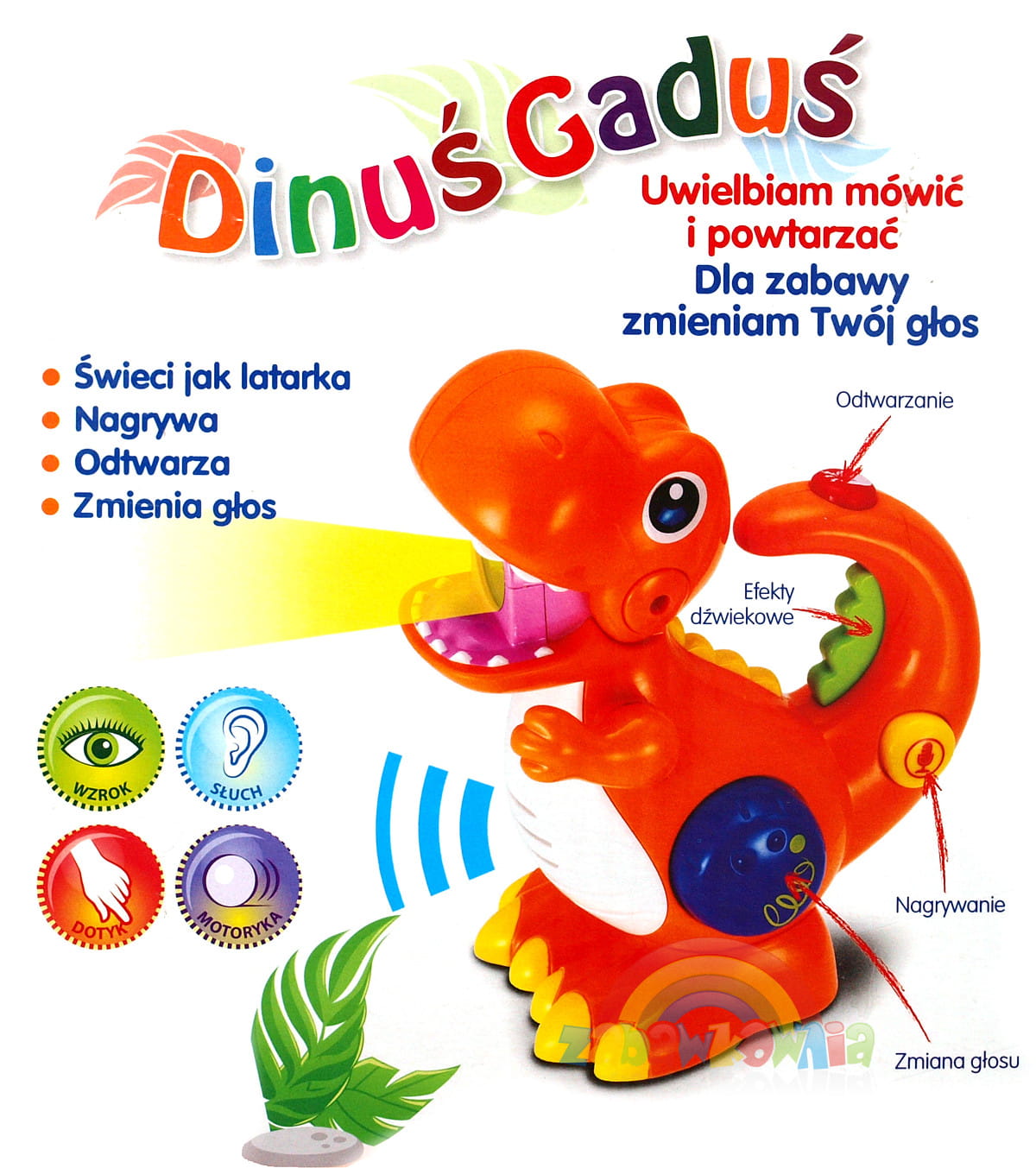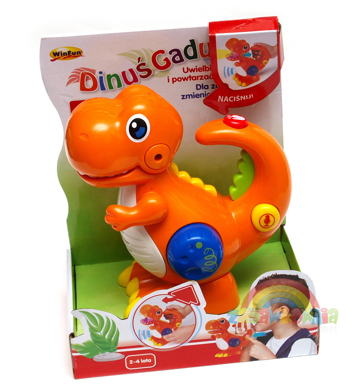 Dinuś, który będzie powtarzała za dzieckiem wypowiadane zdania jego głosem ale nie tylko. Z boku dinozaura znajduje się pokrętło zmieniające głos Dinusia. Może mówić głosem grubym jak dorosły, potężny dinozaur lub szybko i piskliwie jakby dopiero wykluł się z gadziego jaja. Ale dzieci będą miały jeszcze jedną możliwość zabawy. W paszczy Dinusia ukryta jest latarka, która rozświetla się po naciśnięciu przycisku na jego ogonie. A zabawka wydaje wówczas różne śmieszne dźwięki.